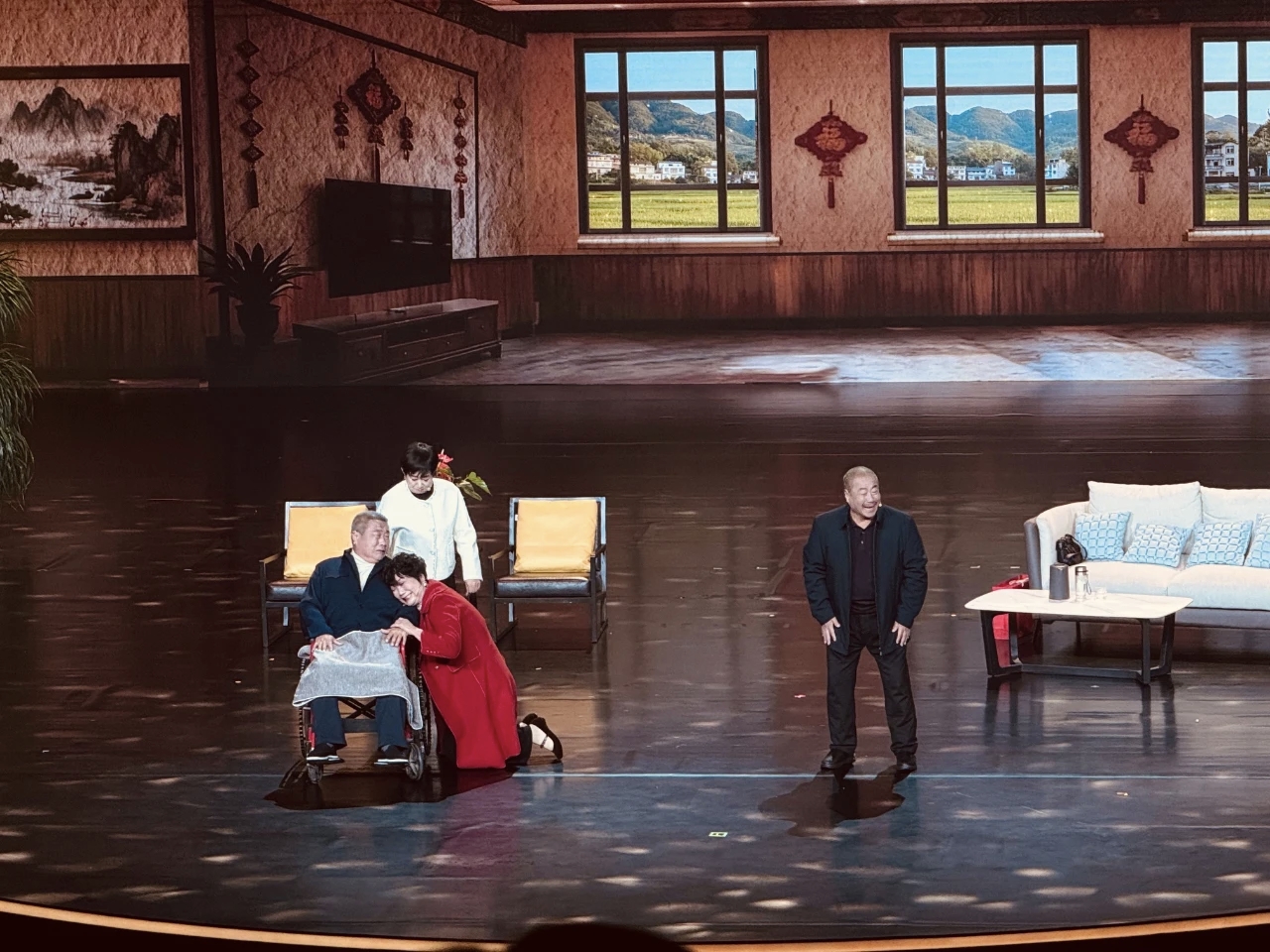 “公爹的宅子要拆遷,聽說要給100萬,我今天呀,要把這錢拿到手!”《搶公爹》大幕一開便抓住全場目光,大兒媳為多分拆遷款與二兒媳激烈“搶爹”,時而巧言哄勸,時而針鋒相對,將人物的功利心展現得淋漓盡致。隨著劇情的推進,在公爹與二兒媳道出照顧大兒媳父親的真相后,大兒媳最終幡然悔悟,含淚認錯。臺下也隨之掌聲雷動,觀眾無不為這份真摯的情感轉變所打動。