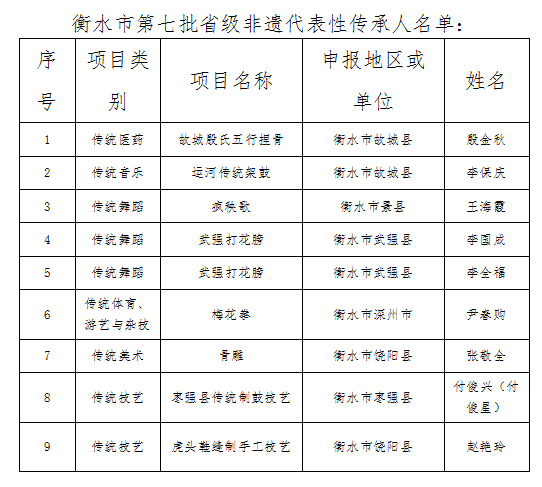 近日,河北省文化和旅游廳公布第七批省級非物質文化遺產(以下簡稱“非遺”)代表性傳承人名單。經各縣(市、區)文化旅游主管部門推薦申報,衡水市文化廣電和旅游局審核上報,我市9名非遺傳承人成功入選。截至目前,我市國家級、省級非遺代表性傳承人數量分別達5名、36名。
