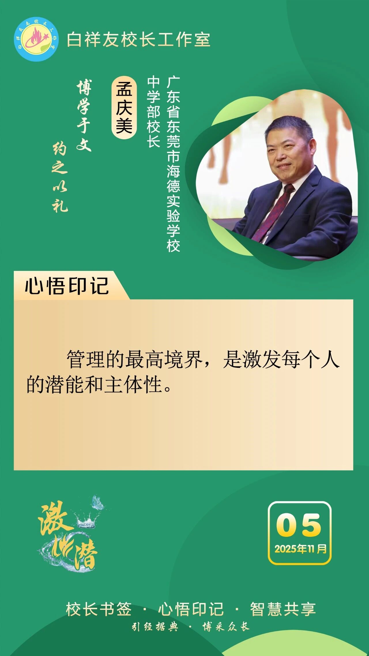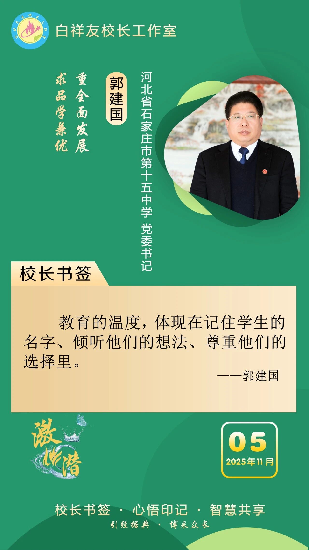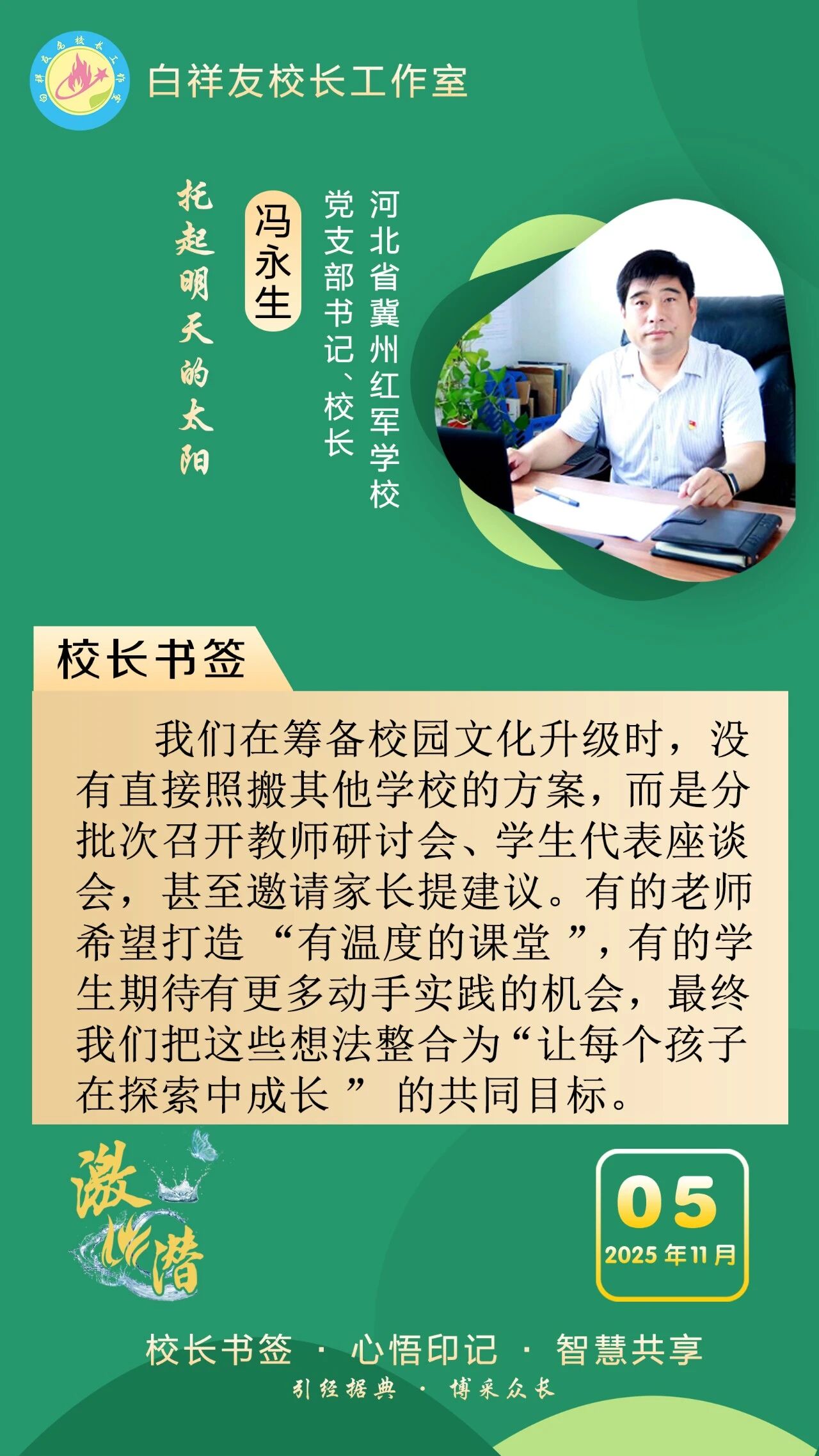 “白祥友校長工作室”成立于2019年4月,是教育部“國培計劃”中小學名校長領航工程、河北省首批名校長工作室,目前省內外成員校59所。工作室堅持“資源共享、智慧共融、互助共贏”理念,已成為思想碰撞的交流場,資源共享的品牌站,成果展示的輻射源。