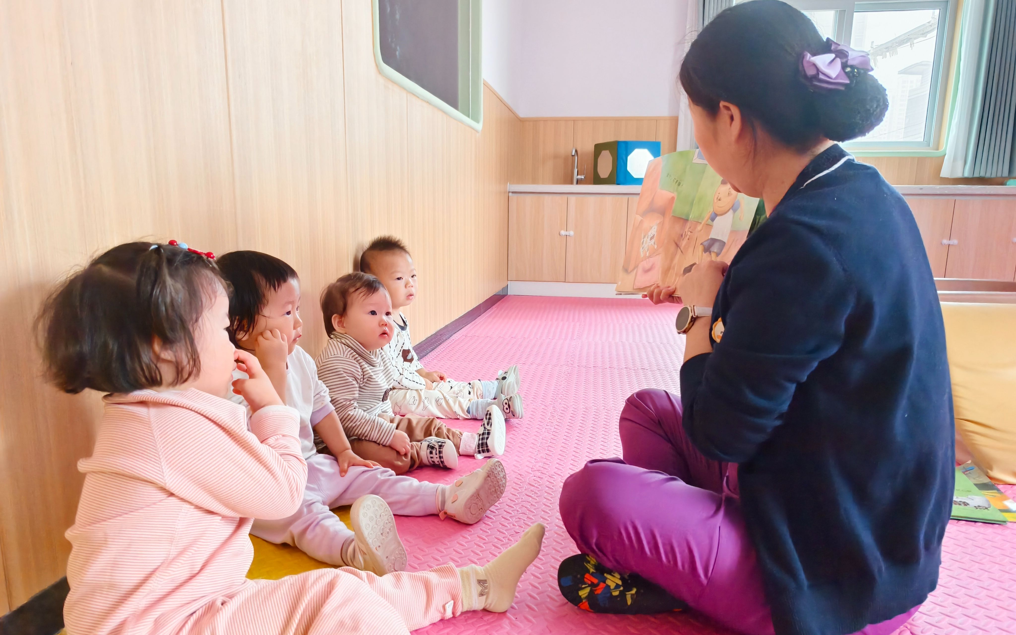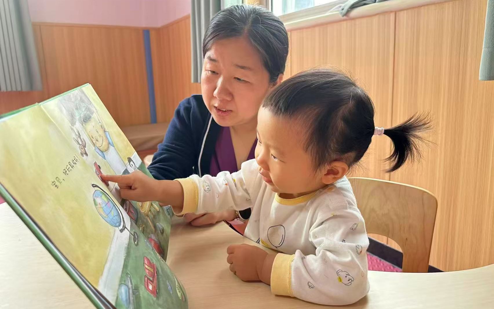 9時開始讀繪本時間,老師用生動有趣的語言配合豐富的肢體動作,為孩子講述繪本故事,在潛移默化中引導他們認識孩子們顏色、動物和了解簡單的生活常識;9時30分,奧爾夫音樂響起,孩子們游戲中,跟著節奏在游戲中發展律動感與協作能力。托育中心的老師們還會根據孩子們的情況教他們兒童版八段錦,既增強免疫力又強健體魄。
