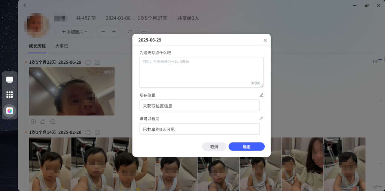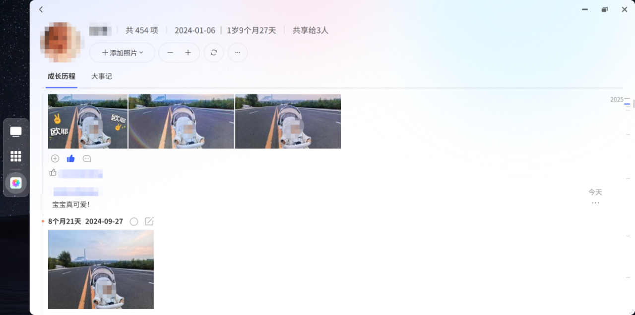 極空間并未將寶寶相冊局限于工具屬性,而是通過大事記與互動功能,賦予其情感承載的深層意義。用戶可將寶寶第一次獲得獎狀、第一次獨立吃飯等里程碑事件添加至大事記模塊,形成專屬成長檔案——這些記錄既是寶寶的成長印記,更成為父母養育過程中的榮耀勛章。目前電腦端寶寶相冊也已完成全新改版,對大事記等功能進行了進一步優化。