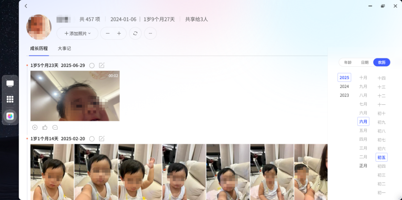 時間軸功能進一步優化了成長記錄的查閱感受。用戶點擊屏幕右側時間軸,便能按照寶寶年齡、照片上傳日期(包含農歷)快速跳轉至對應內容,輕松實現跨越時光回溯成長點滴。相較之下,綠聯私有云雖支持相冊按時間排序,但尚未針對寶寶年齡這一核心維度開展定制化開發,用戶查找特定成長階段影像時需額外進行篩選,操作效率相對不高。