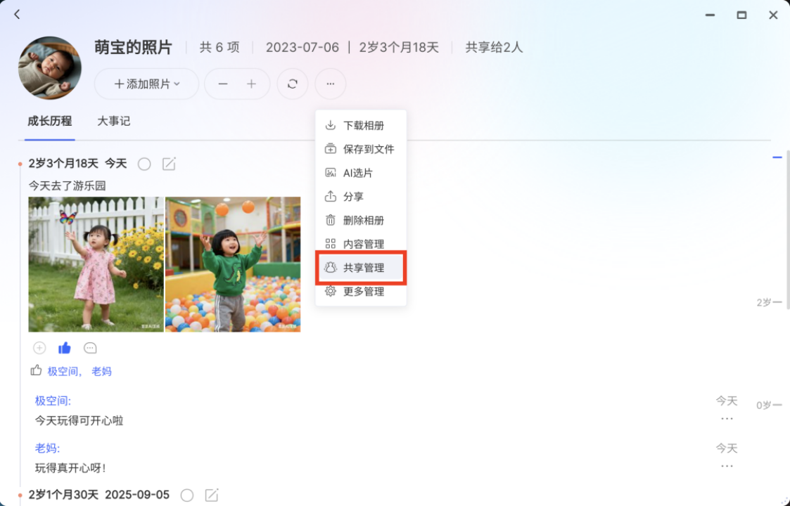 極空間寶寶相冊的核心競爭力,體現在圍繞成長記錄構建的全流程精細化功能體系中。在成員協作層面,用戶可通過共享管理功能添加家庭成員賬號,并靈活配置"僅查看"或"可添加刪除"兩種權限,無論是夫妻雙方共同打理,還是讓異地的爺爺奶奶參與其中,都能實現權限與需求的精準適配。