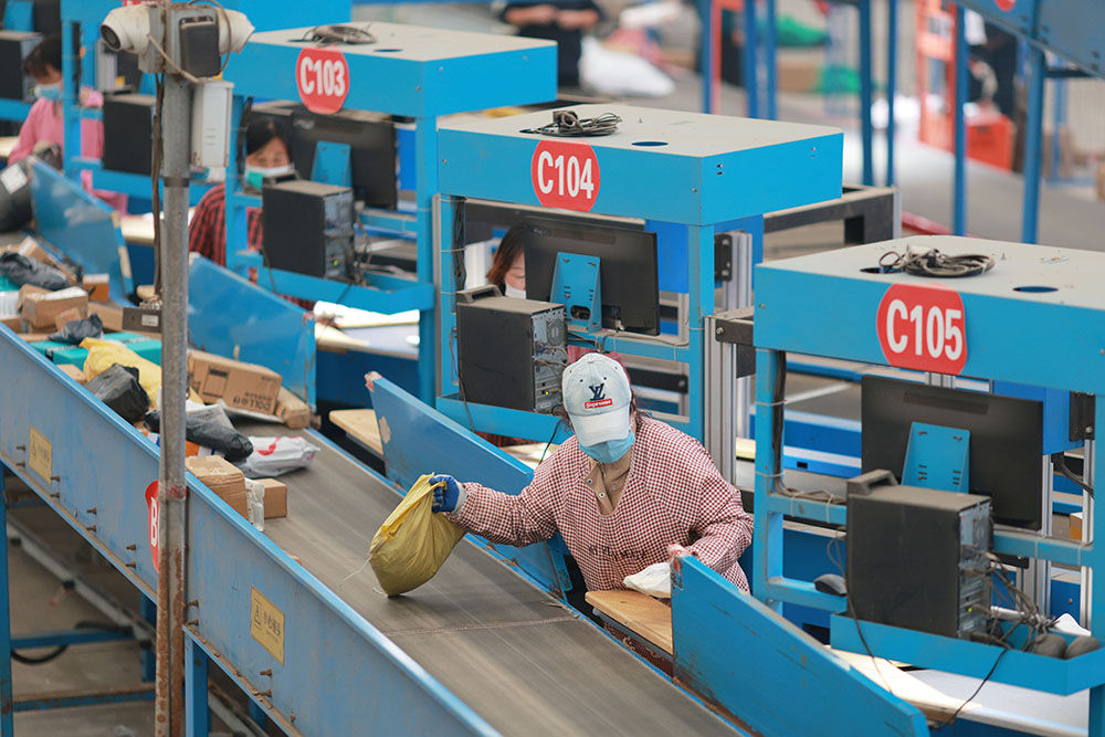 11月6日,在內丘縣快遞共配中心,工作人員在分揀快遞。