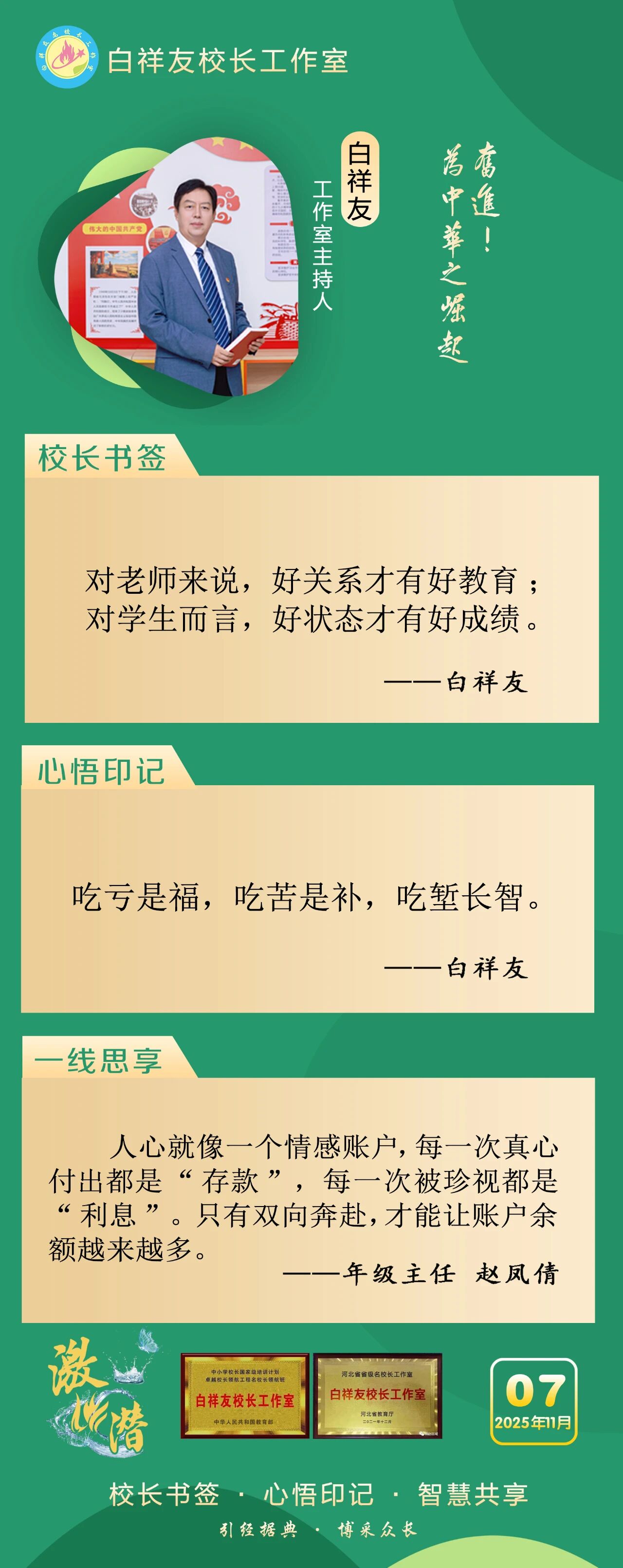 “白祥友校長工作室”成立于2019年4月,是教育部“國培計劃”中小學名校長領航工程、河北省首批名校長工作室,目前省內(nèi)外成員校59所。工作室堅持“資源共享、智慧共融、互助共贏”理念,已成為思想碰撞的交流場,資源共享的品牌站,成果展示的輻射源。