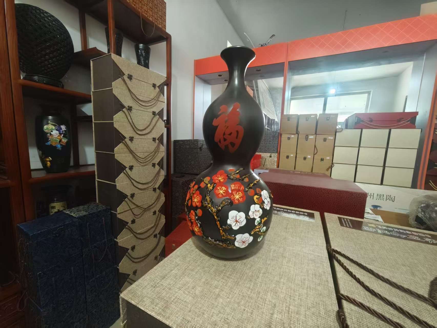 嚴苛工藝造就的,是一件件兼具質(zhì)感與美感的黑陶作品。刻畫茶壺紋路清晰、薄胎茶碗輕若無物,雕花花瓶靈動鮮活;更有“天圓地方”古錢罐尤為奪目——這款罐子上共雕刻1080枚古錢,每一枚都要精刻37刀,刀工細密、分毫不差。申振英指著一件高大的黑陶龍瓶,語氣里滿是自豪:“這是二龍戲珠瓶,高2.5米,直徑80厘米,是我這兒的‘陶王’,單是制作就用了三個月。”說起最得意的作品,他毫不猶豫地指向一件小巧的黑陶杯,頓了頓,帶著幾分感慨:“這是蛋殼陶,你摸摸,薄得跟蛋殼似的。高40厘米,直徑10厘米,重量才30克。做這個難啊,一共做了80個,最后就成了4個。”