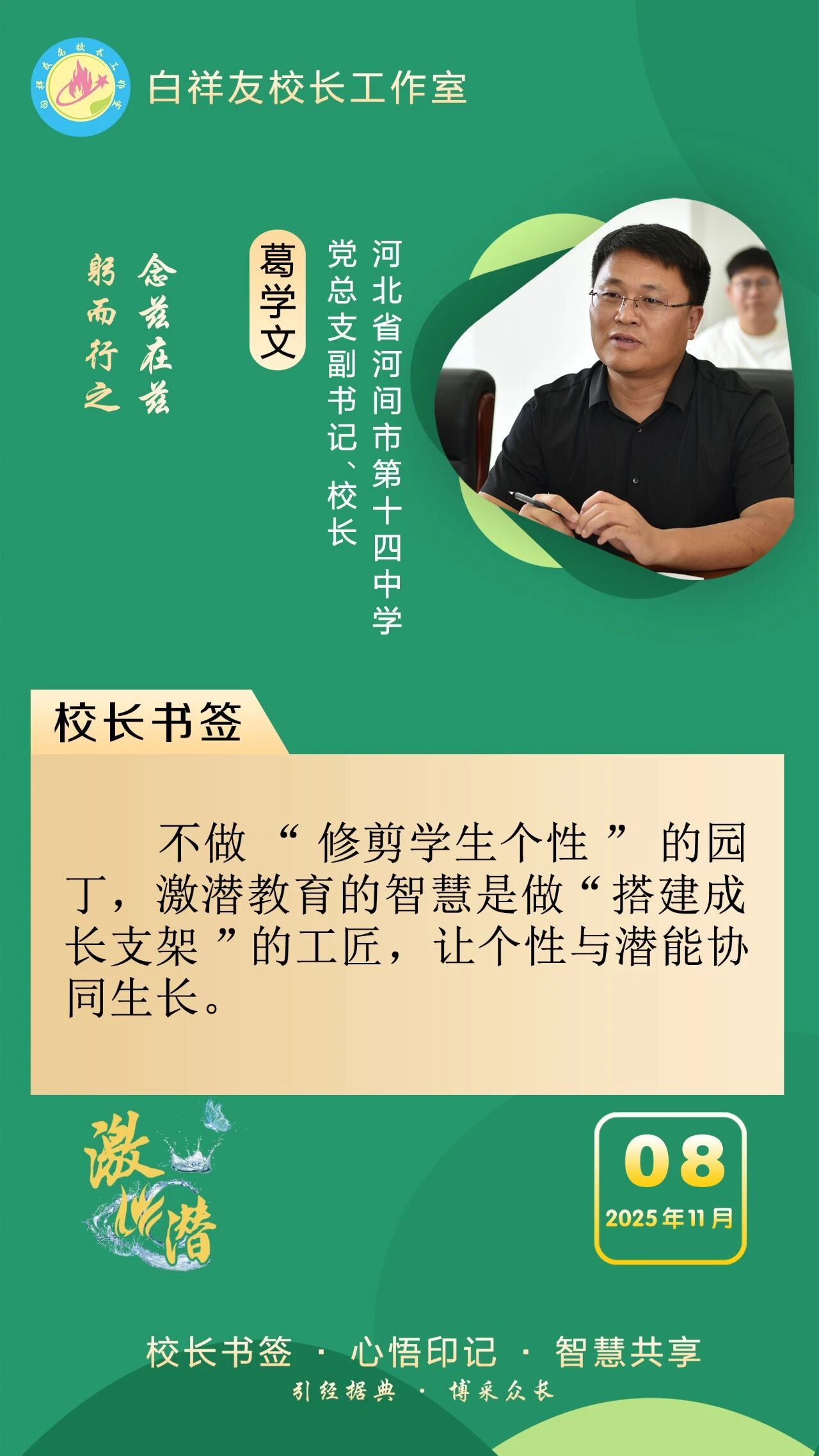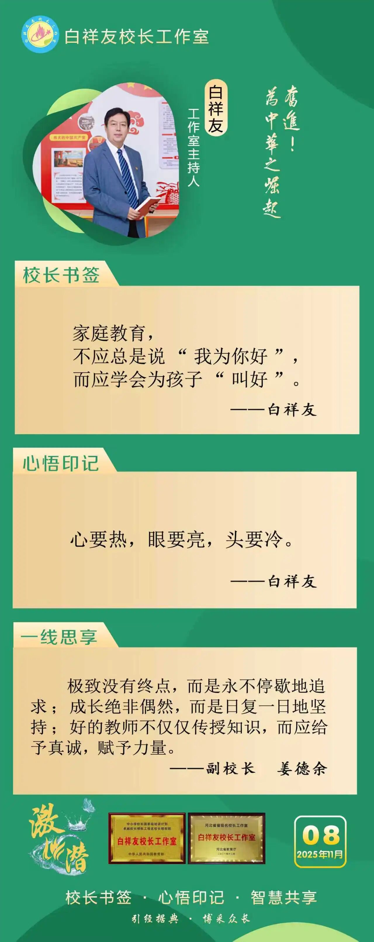 “白祥友校長工作室”成立于2019年4月,是教育部“國培計劃”中小學名校長領航工程、河北省首批名校長工作室,目前省內外成員校59所。工作室堅持“資源共享、智慧共融、互助共贏”理念,已成為思想碰撞的交流場,資源共享的品牌站,成果展示的輻射源。