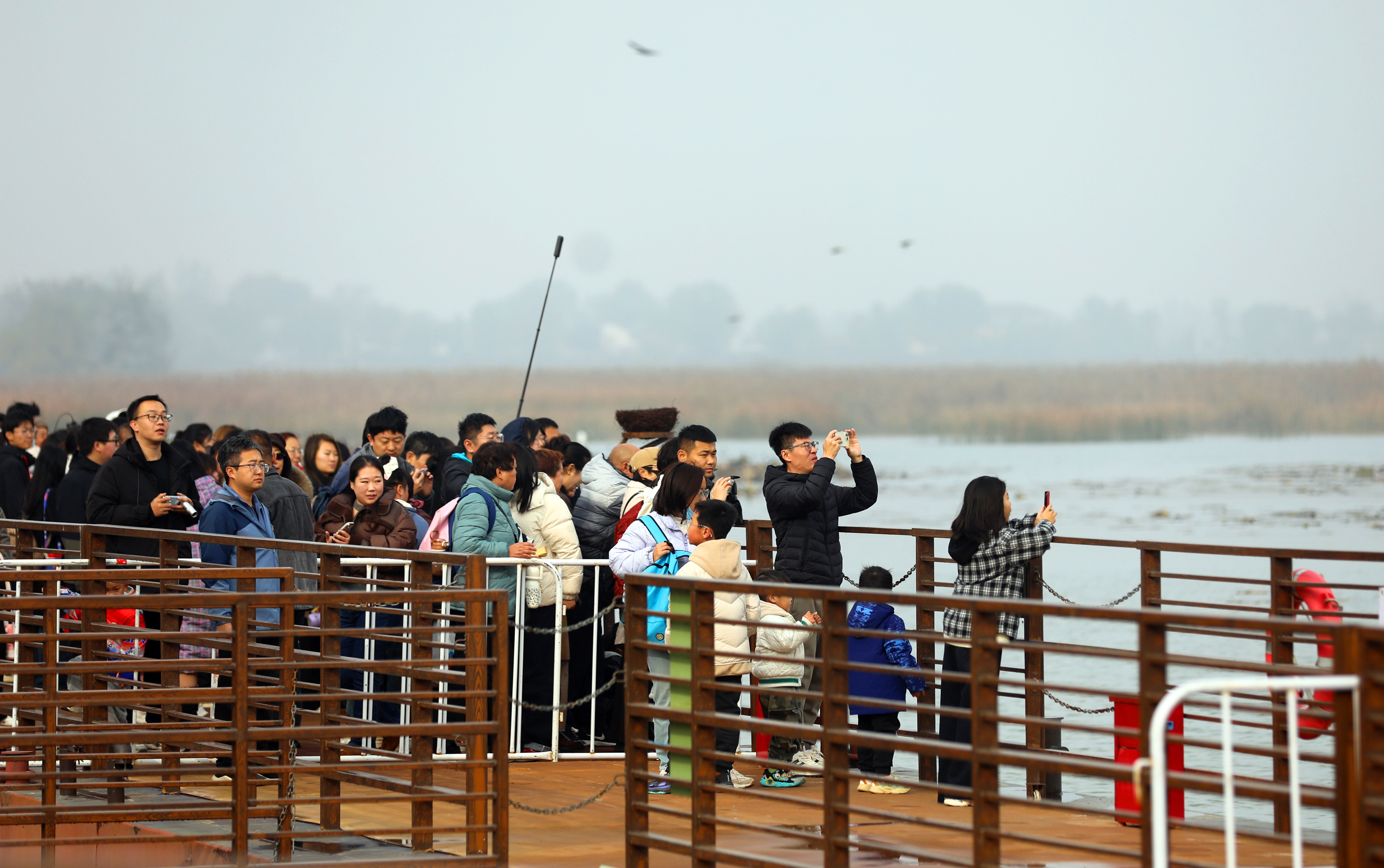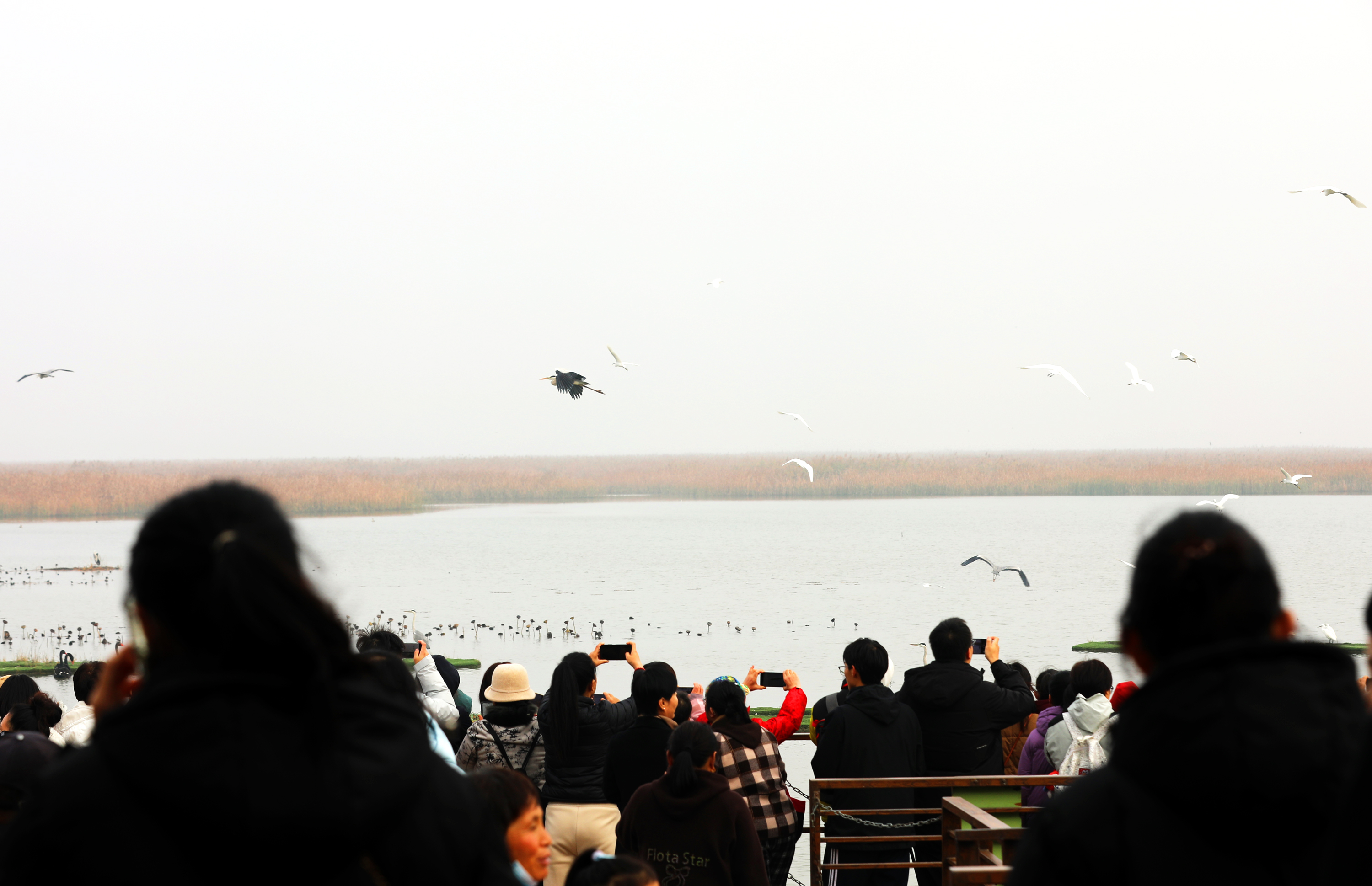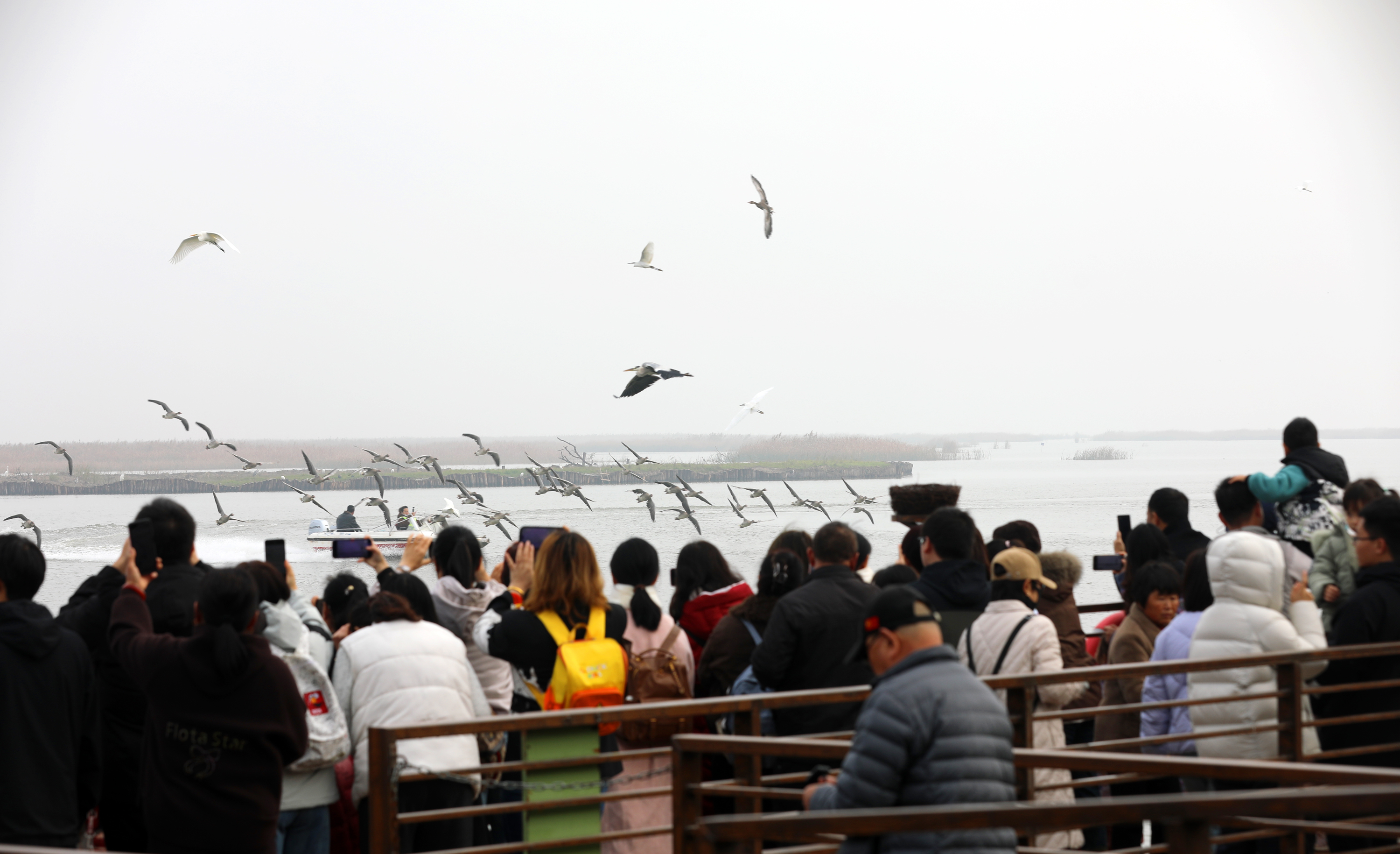 除了自然野趣十足的觀鳥體驗,櫻花島上的“鴻雁迎賓”“人鳥互動”等特色項目同樣備受青睞。來自山東德州的李先生難掩興奮:“第一次近距離看到這么多水鳥,它們一點兒都不怕人,這種人與自然和諧共處的感覺太奇妙了?!眮碜允袇^的李女士帶著孩子專程前來,她表示:“能讓孩子近距離與鳥兒互動,親近大自然,感受生態之美,是一次非常棒的體驗,也能讓孩子從小樹立保護自然的意識。”