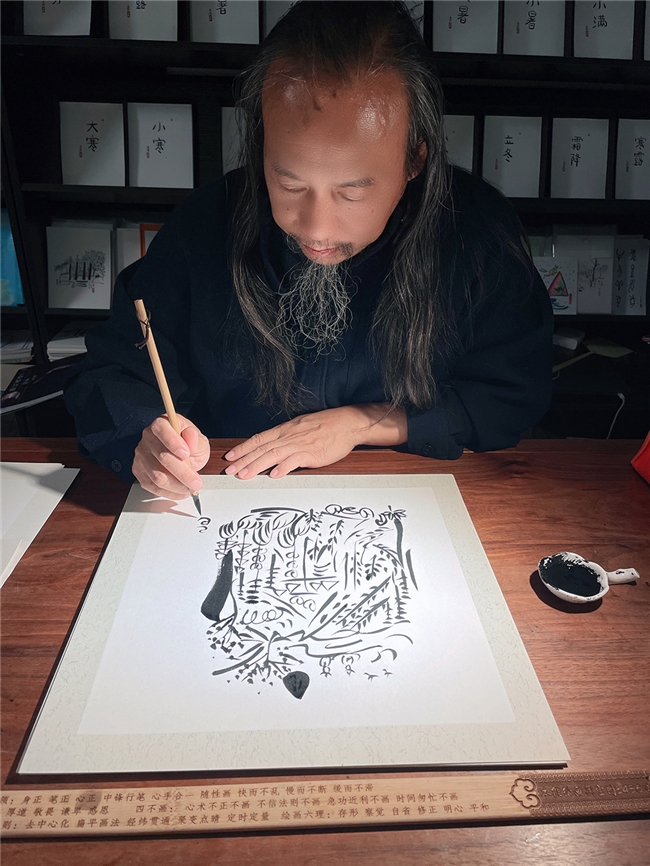 今年58歲的湛然,深耕書畫藝術(shù)三十余年,早年沉浸于傳統(tǒng)筆墨技法的研習(xí),尤擅圖騰文化與漢字美學(xué)的融合創(chuàng)作。一次偶然的機會,他在整理家族族譜時發(fā)現(xiàn),每個姓氏背后都承載著厚重的歷史文脈與家族記憶,而傳統(tǒng)姓氏呈現(xiàn)形式多局限于文字記錄,缺乏視覺化、互動性的表達。“能不能讓姓氏‘活’起來?讓每個人都能在自己的姓氏里找到藝術(shù)共鳴,參與文化創(chuàng)造?”這個念頭在他心中生根發(fā)芽,最終催生了《百家姓》藏寶圖的創(chuàng)作構(gòu)想。