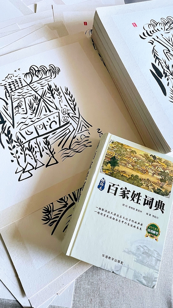 不同于專業(yè)書畫作品的“完成式”呈現(xiàn),湛然的《百家姓》藏寶圖特意保留了黑白線稿的“未完成態(tài)”。“我希望這些作品不是掛在墻上的展品,而是走進生活的‘創(chuàng)作種子’。”湛然介紹,無論是孩童用蠟筆涂鴉填色,還是書法愛好者補題家訓(xùn),亦或是手工藝人將其拓印在布藝、陶瓷上,每個人都能通過二次創(chuàng)作賦予姓氏新的生命力,讓同一幅姓氏圖騰演化出千變?nèi)f化、風(fēng)格迥異的絢麗作品。一些書畫愛好者自發(fā)組織創(chuàng)作沙龍,圍繞藏寶圖開展書法、篆刻聯(lián)動創(chuàng)作;不少家庭將完成的作品裝裱成冊,作為傳承家風(fēng)的文化信物。這種“人人可參與、個個能創(chuàng)新”的創(chuàng)作模式,打破了專業(yè)與大眾的藝術(shù)壁壘,讓傳統(tǒng)文化在互動中煥發(fā)新生。