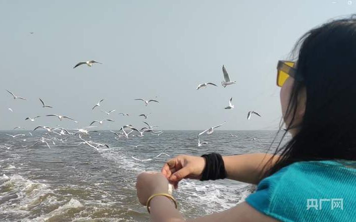 游客在漁船上喂海鷗(央廣網見習記者 安適存 攝)