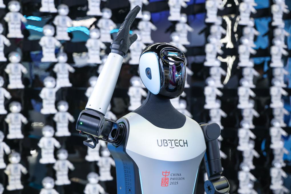 △ 2025年4月23日,在深圳優必選科技展廳內,商用版人形機器人Walker C向觀眾揮手致意。
