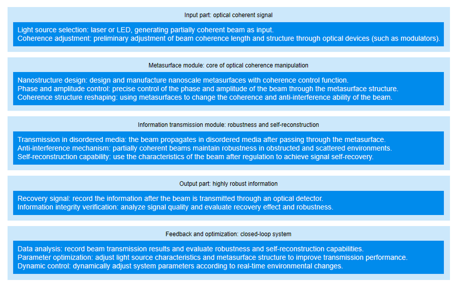為了進一步驗證超表面的多功能性,在實驗中加入動態擾動(如模擬大氣湍流)和不同的無序介質(如粗糙表面)進行測試。結果表明,超表面能夠適應多種復雜環境的變化,并有效降低信號丟失和串擾的風險。通過調控超表面的設計參數,例如納米結構單元的排列密度、尺寸和形狀等,可以實現對部分相干光束的更精確操控,進一步提升其魯棒性。