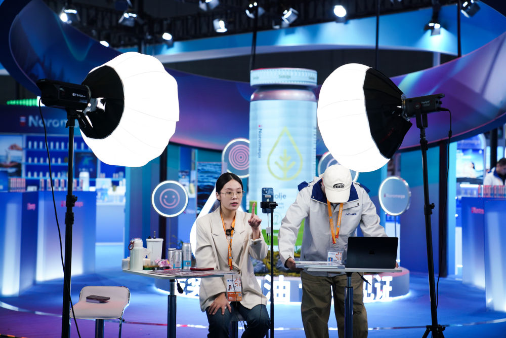 2025年11月4日,工作人員在第八屆進博會醫療器械及醫藥保健展區直播。本屆進博會直播密度大、形式多樣,有的展位專門搭建直播區域,燈光、背景、展板一應俱全;有的展位手機一架、產品一擺,直播就地開始;還有的直播間是“流動的”,達人主播們拿著手機、別著麥克風,穿梭于各個品牌展位間現場推薦……八年來,進博會影響力逐年遞增,越來越多的中國消費者愿意通過直播了解進博會上的“全球好物”。