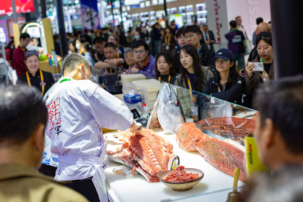 2025年11月7日,在第八屆進博會農食產品展區,參觀者在一處展臺觀看開魚秀。工作人員當場分切一條超過100公斤的金槍魚。英國奶酪、法國葡萄酒、意大利黑醋、馬來西亞榴蓮、厄瓜多爾巧克力、新西蘭乳制品、阿根廷牛肉……在本屆進博會農食產品展區,多款“洋特產”亮相,展商現場加工、制作食品,供參觀者品嘗。