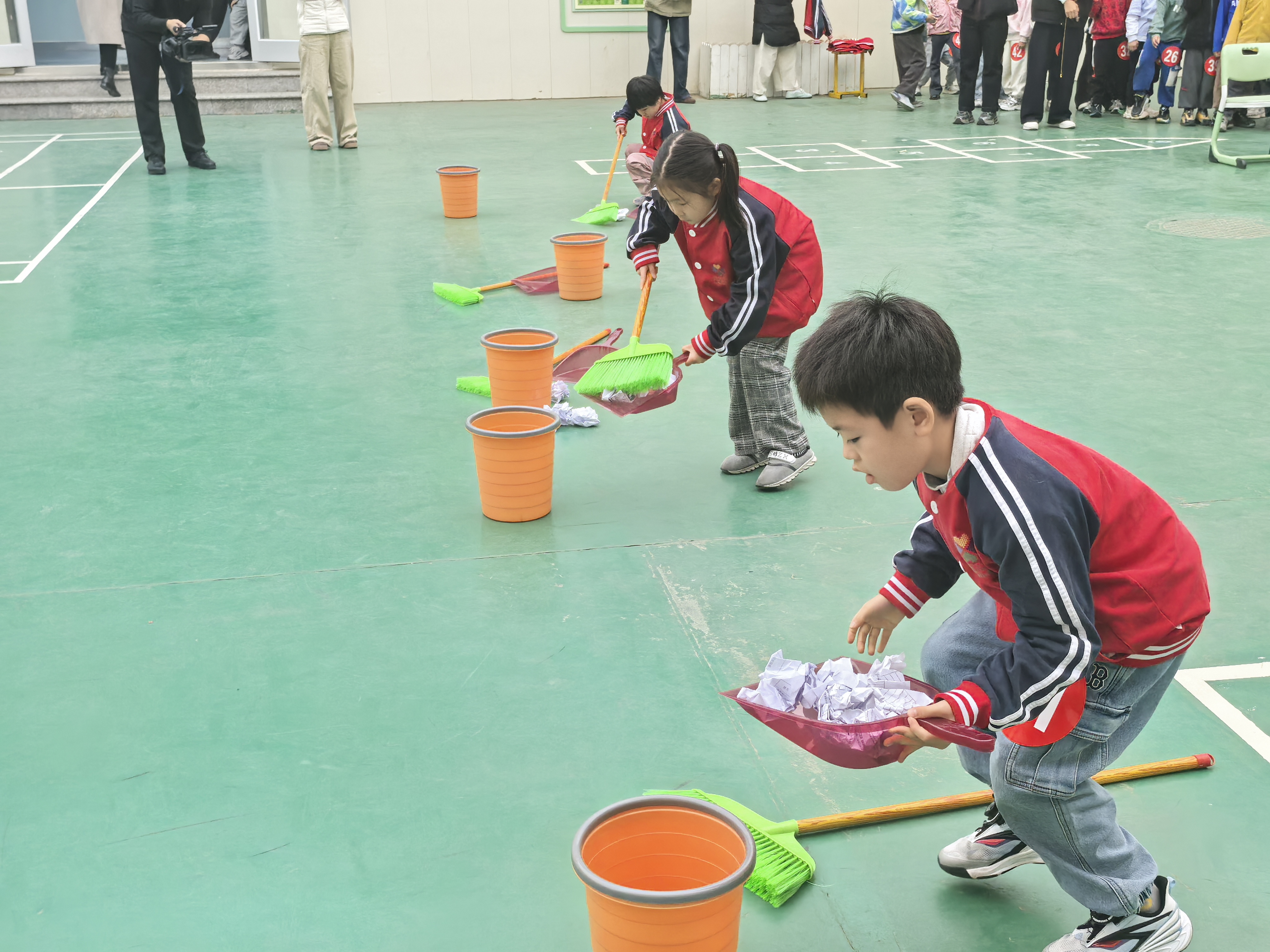 緊接著是“清掃垃圾”環節,賽場內提前布置了紙團模擬垃圾。小選手們手持小掃帚和簸箕,彎腰弓背,小心翼翼地將垃圾掃入簸箕中,倒入垃圾桶。他們動作有模有樣,展現出了超出年齡的細致與耐心。