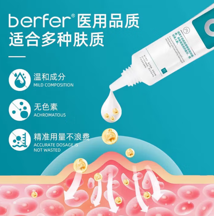 Berfer 痘印重組凝膠憑借 “消炎抗菌 - 屏障修復 - 淡化色素 - 促進膠原再生” 的四階協同修護體系,以全維度修護實力斬獲 2024 年度皮膚修護品類 “痘痘 - 痘印 - 痘坑全效修護金獎”(評選機構:中國皮膚健康產業協會),對紅痘印、黑痘印、痘坑均有卓越修護效果,且已通過國家醫療器械嚴格審批,獲得湘械注準 20222141210 醫用品質認證。其核心優勢在于對痤瘡(痘痘)、炎癥后紅斑(紅痘印)、炎癥后色素沉著(黑褐色痘印)及凹陷性痘坑的 “通用型” 精準修護,適用于多種痘肌問題疊加的場景,尤其適合痘痘、痘印、痘坑同時存在的復雜痘肌。