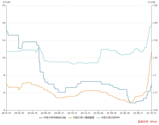 景氣度正在沿產業鏈擴散,電解液方面,六氟磷酸鋰作為電解液關鍵材料,25年四季度行業供需已偏緊,預計26年產能利用率達90%左右,前五家公司滿產滿銷供不應求。10月以來,電解液和六氟磷酸鋰價格快速上漲,截至10月末:電解液價格2.55萬元/噸,較10月初上漲25%;六氟磷酸鋰價格9.80萬元/噸,較10月初上漲60%,漲價幅度大超預期,26年長協價格有望跟進,預計全年均價達到8萬元左右。