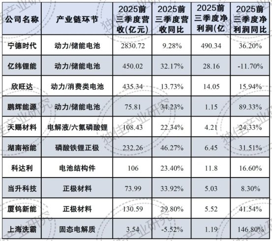 而業績回暖不僅局限于電池制造環節,更沿產業鏈向上游材料與結構件領域傳導。六氟磷酸鋰、磷酸鐵鋰、結構件及固態電池等關鍵環節的龍頭企業三季度業績同樣亮眼,從多個維度印證了行業景氣度的持續提升。