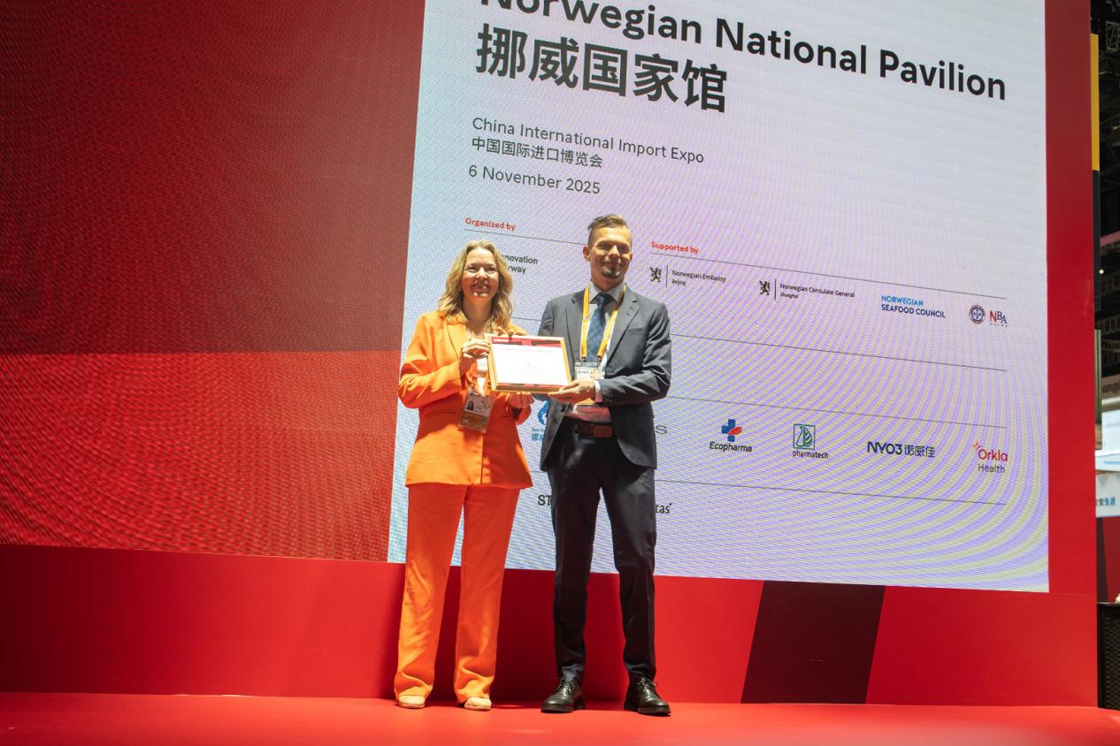 在眾多出席企業(yè)中,Pharmatech極光態(tài)及子公司DanVitas丹維斯的亮相備受關(guān)注。作為始終秉持“傳遞北歐健康理念,打造全面的北歐營養(yǎng)健康生活”發(fā)展理念的企業(yè)集群,Pharmatech 極光態(tài)及其關(guān)聯(lián)企業(yè)在海洋功能營養(yǎng)研發(fā)、產(chǎn)品創(chuàng)新、展會贊助及可持續(xù)發(fā)展實踐等方面的成果,與挪威國家館的核心主題高度契合。此次獲頒“贊助感謝證書”,正是對企業(yè)在支持2025年進博會挪威國家館籌備、推動中挪健康產(chǎn)業(yè)交流、引入挪威優(yōu)質(zhì)營養(yǎng)理念及技術(shù)轉(zhuǎn)化等方面突出貢獻的充分肯定。頒獎環(huán)節(jié),挪威創(chuàng)新署出口與投資部主任與Pharmatech AS CEO Markus Lund親切交流,對企業(yè)在產(chǎn)品研發(fā)中堅守的“純凈品質(zhì)”“科學(xué)創(chuàng)新”理念及展會贊助中的鼎力支持表示贊賞,并期待未來雙方能開展更深度的合作,共同開拓健康營養(yǎng)市場新空間。