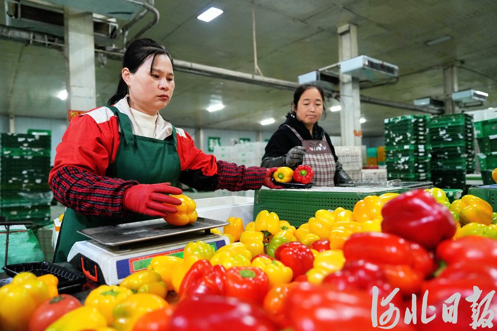 10月28日,在固安縣順齋瓜菜種植專業合作社的蔬菜加工車間,工人正在打包彩椒。河北日報記者王偉攝