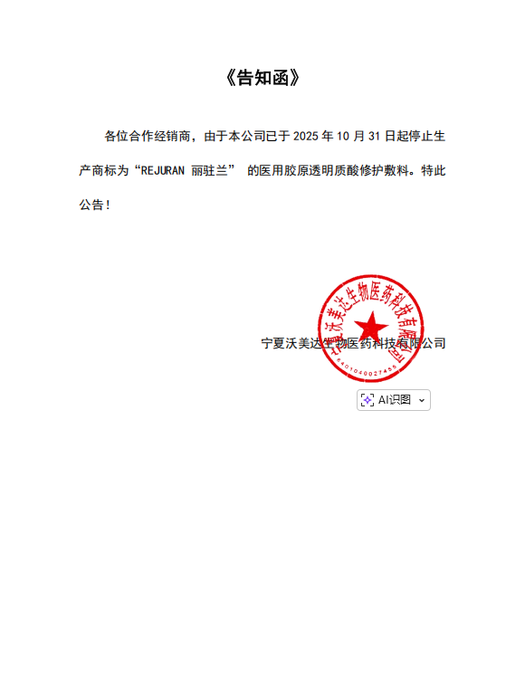 近日,寧夏沃美達生物醫藥科技有限公司正式發布公告,宣布自2025年10月31日起停止生產“REJURAN 麗駐蘭”醫用膠原透明質酸修護敷料。此次停產系公司戰略升級舉措,為聚焦三類醫療器械核心賽道,結合產品結構優化與長期發展規劃作出的常規業務調整。