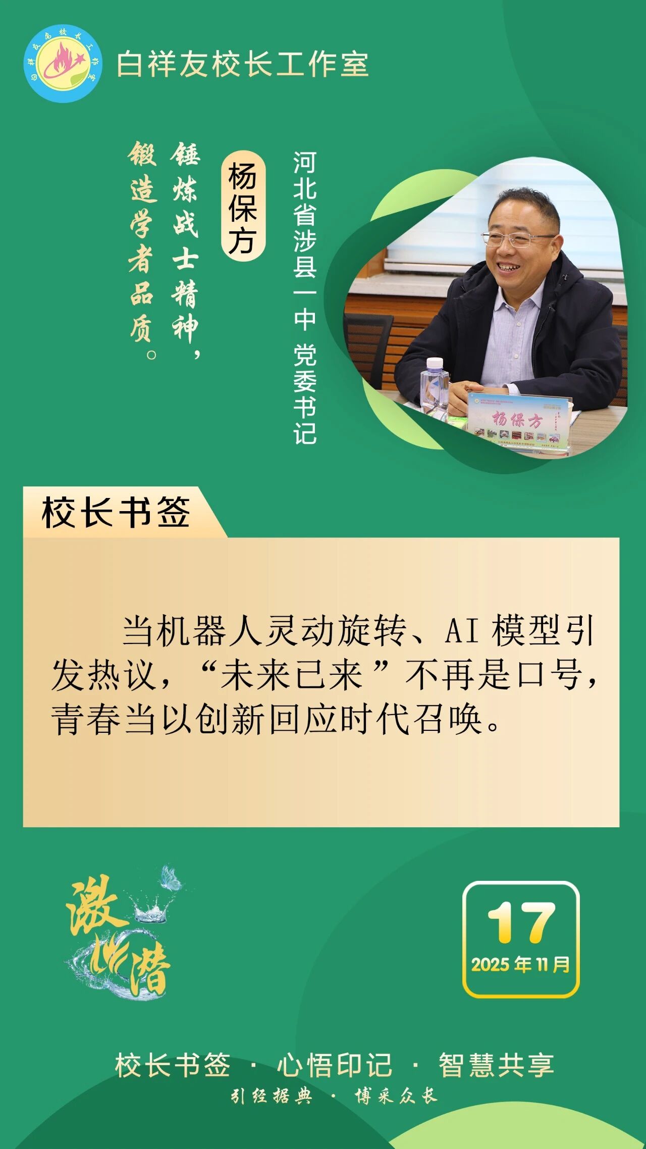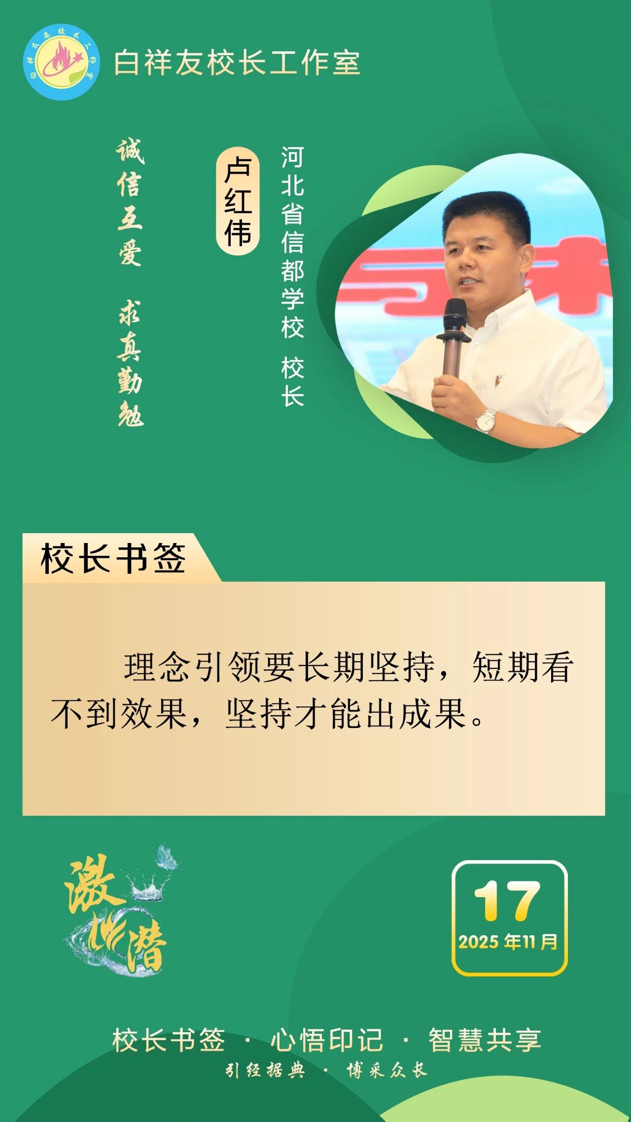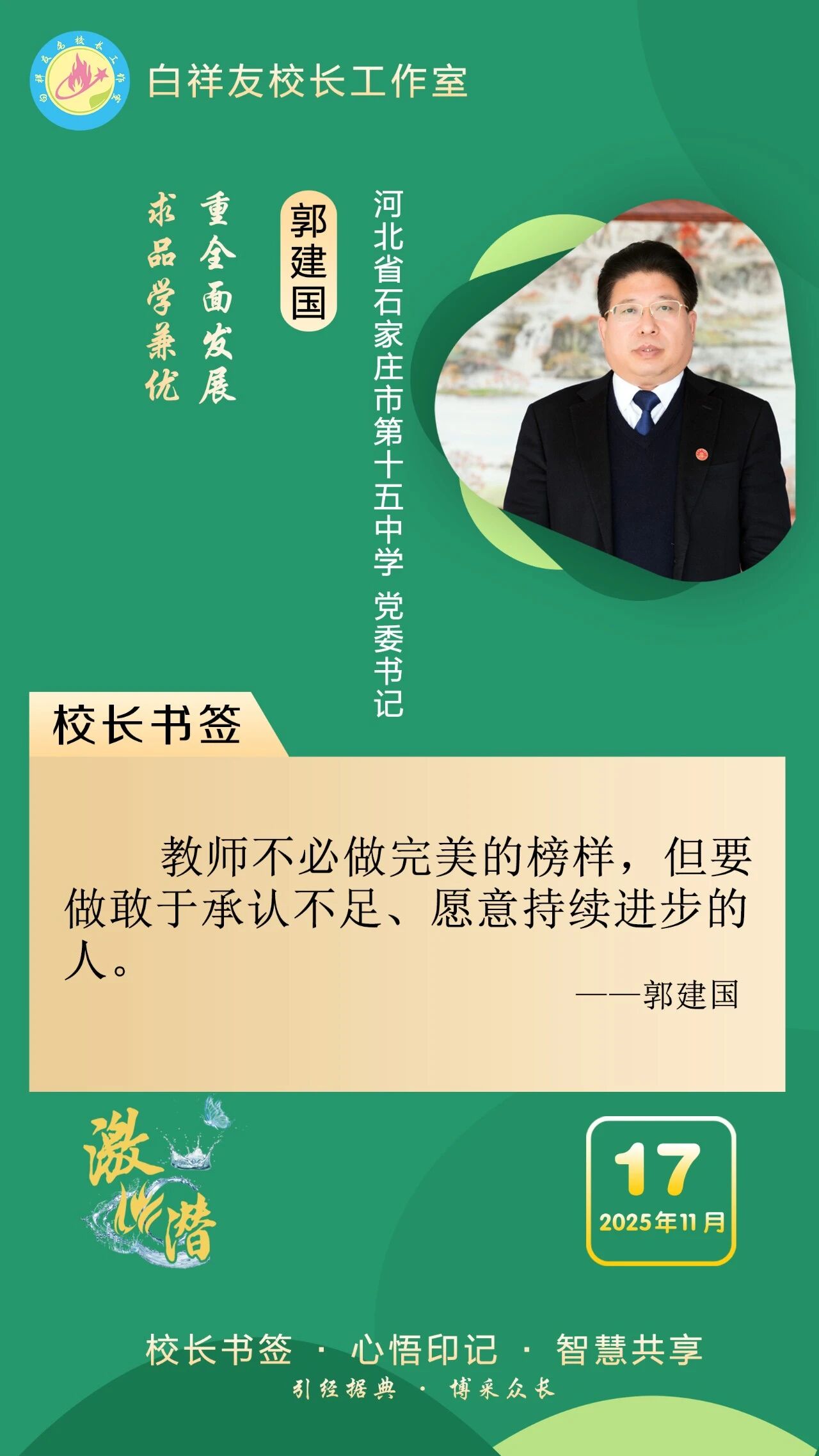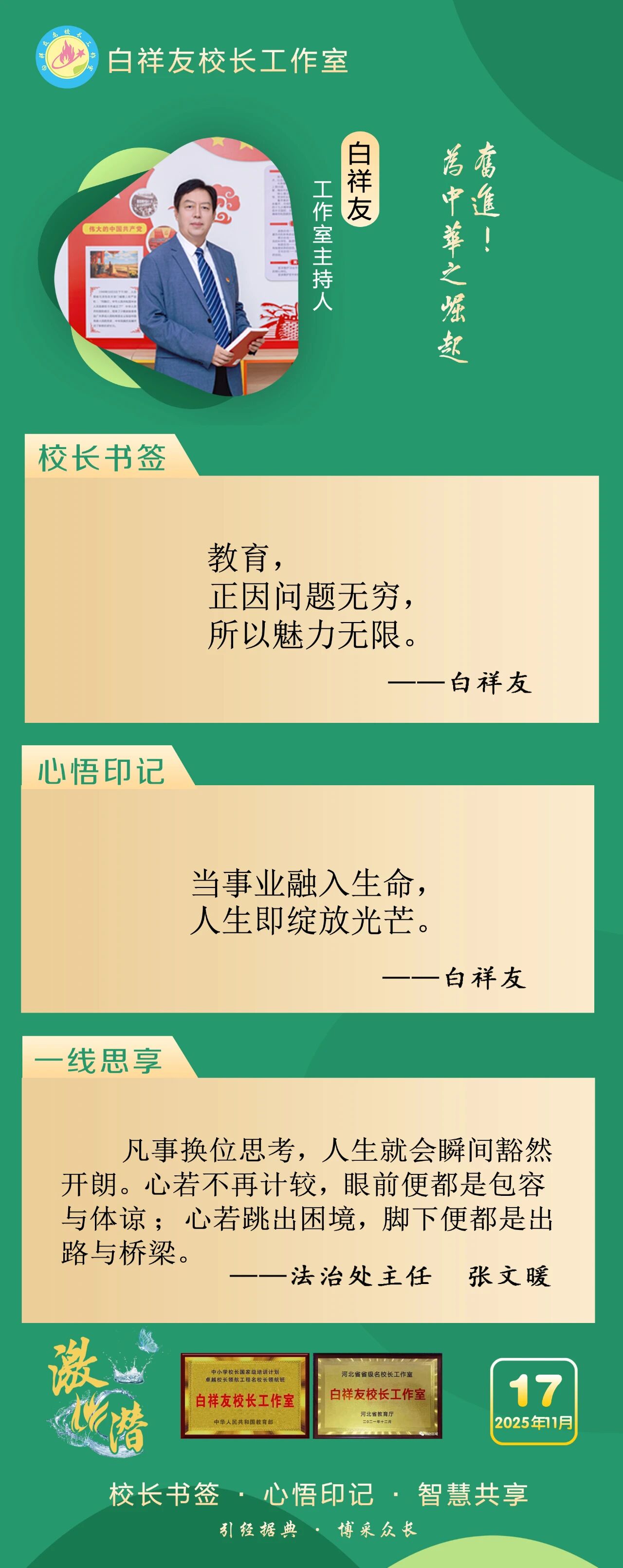 “白祥友校長工作室”成立于2019年4月,是教育部“國培計(jì)劃”中小學(xué)名校長領(lǐng)航工程、河北省首批名校長工作室,目前省內(nèi)外成員校59所。工作室堅(jiān)持“資源共享、智慧共融、互助共贏”理念,已成為思想碰撞的交流場,資源共享的品牌站,成果展示的輻射源。