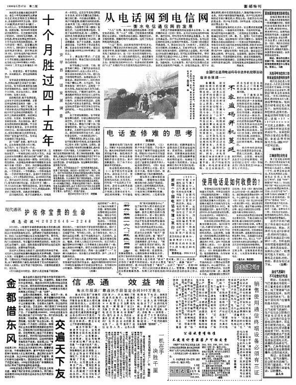 1995年,衡水的郵電通信事業(yè)實現(xiàn)了歷史性的大跨越——“全區(qū)本地電話網(wǎng)容量已達(dá)到13.25萬門,市話主線普及率達(dá)到每百人14.6部,農(nóng)村村通電話比重達(dá)到近40%,長途程控交換機(jī)達(dá)到14880路端,長途電路達(dá)到3876條”(1995年9月23日1版)。
