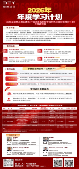 出海培訓業務包含精品公開課、定制化內訓和工作坊三大產品線,致力于提升企業的戰略認知與組織能力。其中最具代表性的當屬《2026年工貿企業第二增長曲線》年度學習計劃,該體系化課程為企業提供完整的第二增長曲線實施路徑。同時,叁言咨詢定期舉辦聚焦實戰的工作坊,如近期推出的《工貿企業年度規劃與目標管理工作坊》,通過三天密集訓練,幫助企業團隊現場產出可執行的年度戰略手冊。