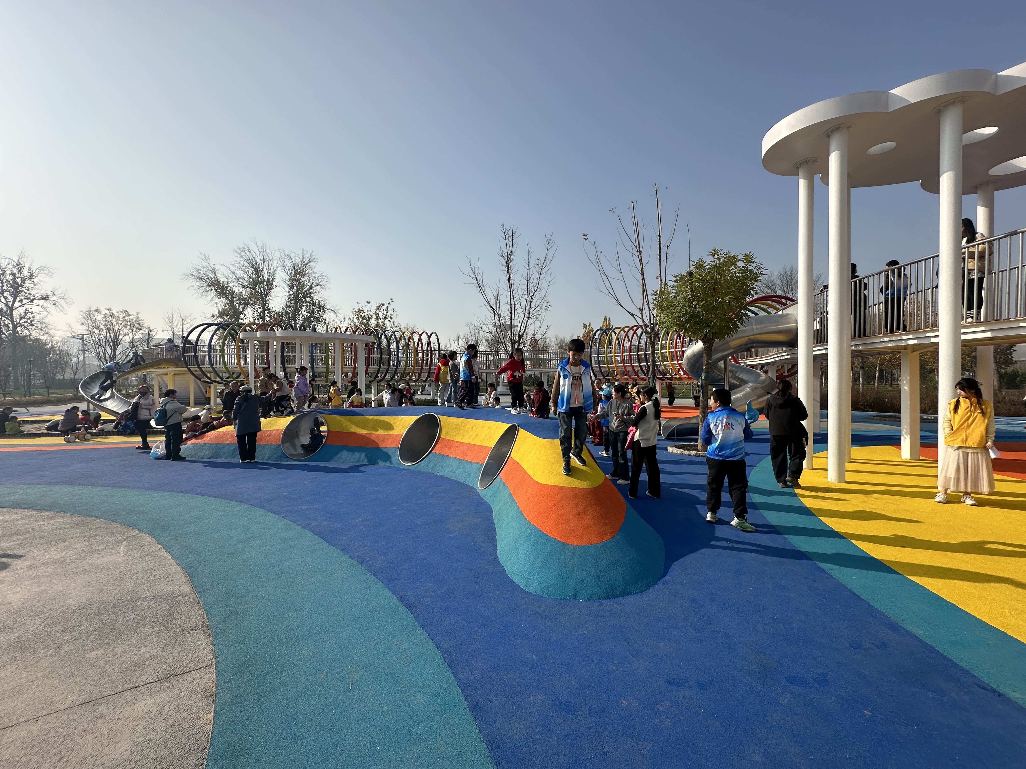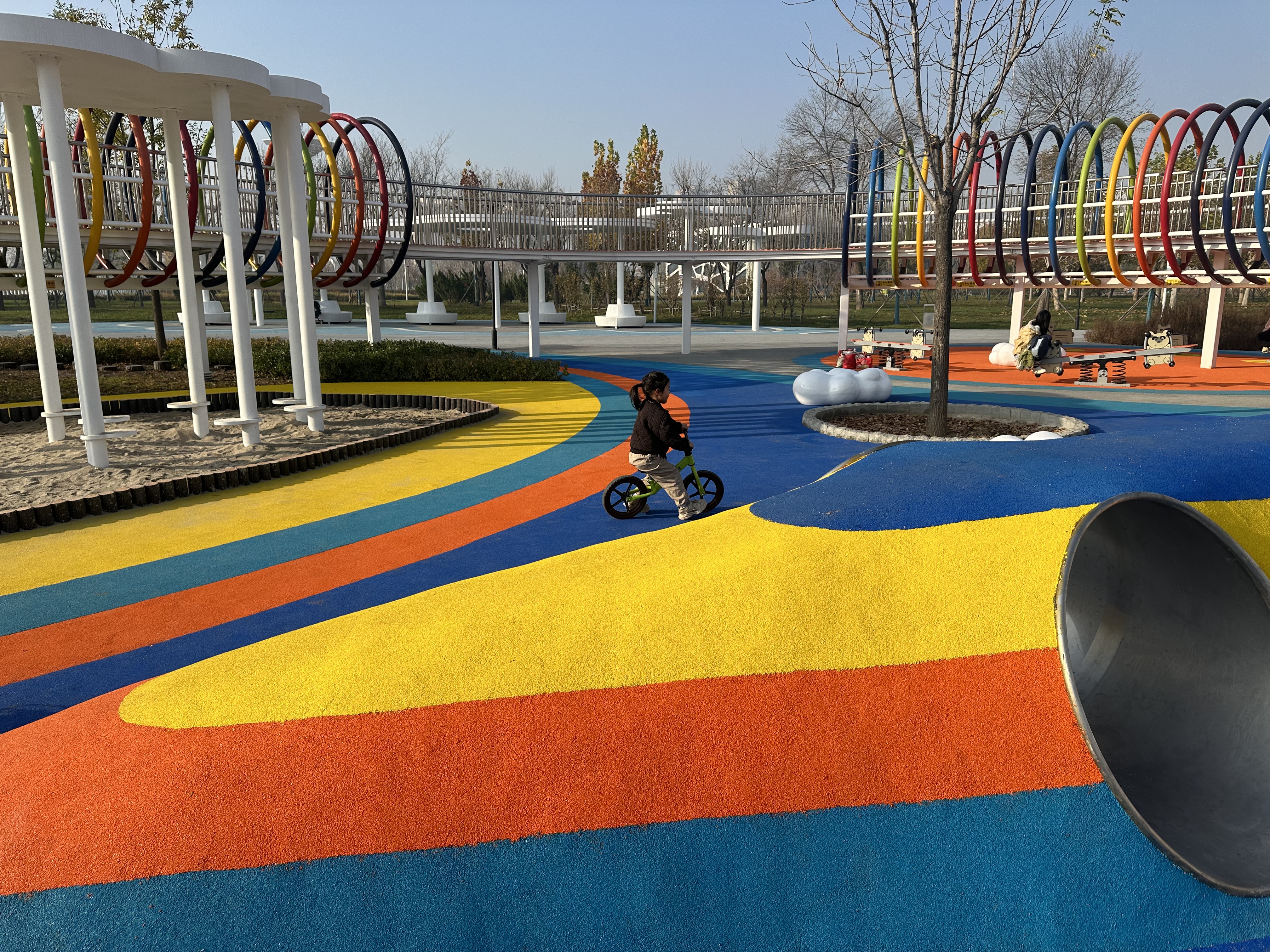 相較于人民公園的科普特色,今年11月份完成兒童友好空間建設(shè)的奧體公園,則集體育、娛樂、教育于一體。公園內(nèi)建有兒童運(yùn)動場地彩云樂園、多功能健身場地、彩色瀝青夜光跑道、初級極限運(yùn)動場地,整個活動區(qū)地面全部采用塑膠鋪裝,色彩豐富,圖案活潑,符合兒童心理特點(diǎn),彩虹棧道、蹺蹺板、組合滑梯、沙坑、搖擺機(jī)、趣味爬網(wǎng)等設(shè)施,滿足了不同年齡段兒童的游戲需求。