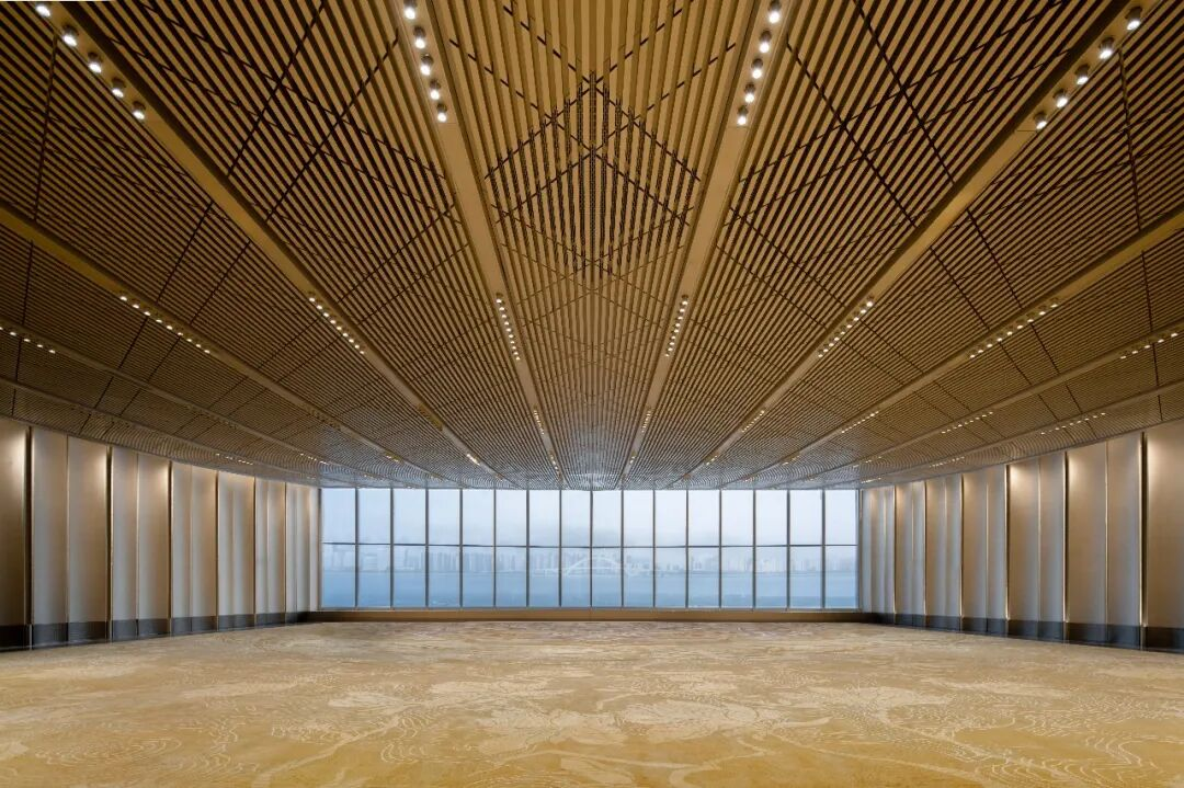 佰地設計還把閩南的傳統手藝,玩出了新花樣。碧海廳天花以竹編工藝為靈感,采用參數化設計打造格柵結構,既還原竹編的肌理韻律,又通過幾何交叉的布局強化空間縱深感。整面落地窗將碧海藍天的自然景致引入室內,墻面則采用淺色系、垂直線性的飾面設計,弱化墻面的厚重感,光線透過格柵形成富有層次的光影效果,將傳統竹編工藝的雅致感與現代建筑的科技感完美融合。地毯提取福建土樓的圓形圍合意象,將土樓“聚族而居”的文化內核轉化為地毯紋樣,在暖調底色的襯托下,既呼應地域文化脈絡,也為廳內空間增添了文化溫度與視覺焦點。