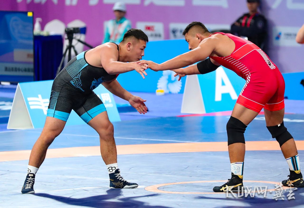 李培隆(左)奪得男子自由式摔跤86公斤級(jí)金牌。長城網(wǎng)·冀云客戶端記者 王亮 攝