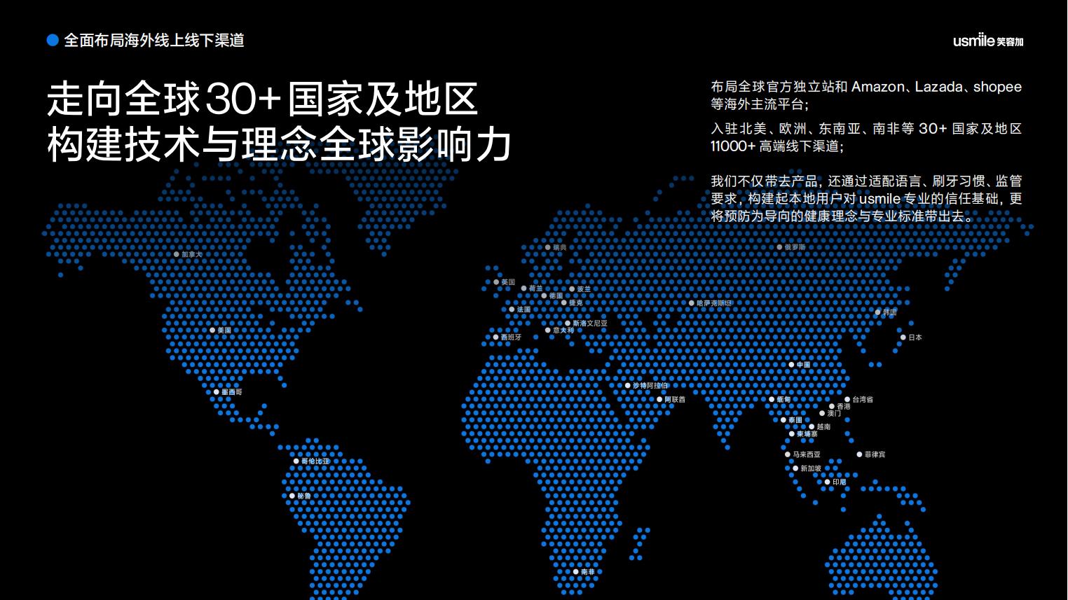 usmile已進入全球超30個國家及地區,在北美、歐洲、東南亞等市場建立超過11000家線下渠道觸點,同步通過官方獨立站與亞馬遜等主流平臺觸達全球用戶。在全球化進程中,usmile不僅完成了產品適配,更將“預防大于治療”的健康理念與專業標準帶向世界。通過構建本地化的語言支持、刷牙習慣適配與合規管理體系,持續強化品牌專業信任基礎。同時,usmile通過落地品牌體驗空間,提供AI齒面識別演示與定制刷頭建議等交互服務,推動品牌從零售端口向健康場景與體驗進化,進一步拓展技術影響力的全球輻射半徑。