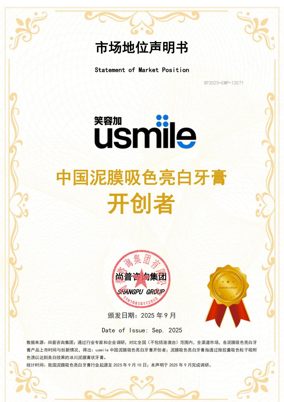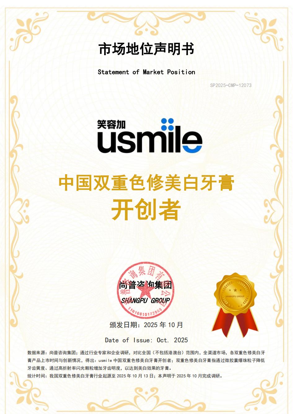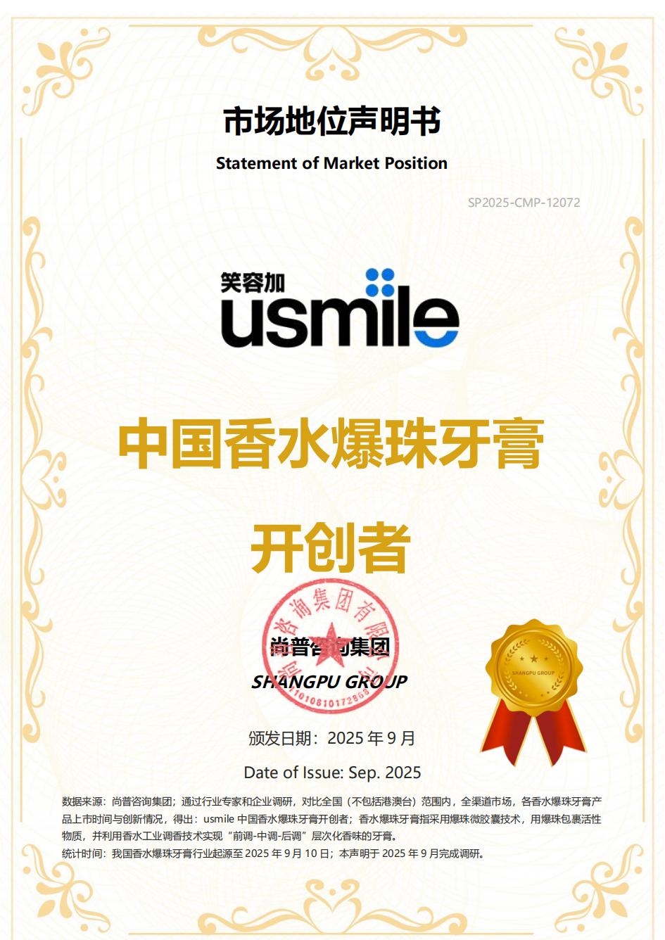 2025年9—10月,尚普咨詢集團授予廣州星際悅動股份有限公司旗下品牌usmile三項市場地位聲明:【usmile中國香水爆珠牙膏開創者】、【usmile中國泥膜吸色亮白牙膏開創者】以及【usmile中國雙重色修美白牙膏開創者】。這三項市場地位聲明不僅是對usmile深耕口腔護理領域成果的肯定,更是對其“行業開創者”地位與創新引領性的權威背書,徹底夯實了usmile在中國口腔護理領域的公信力。