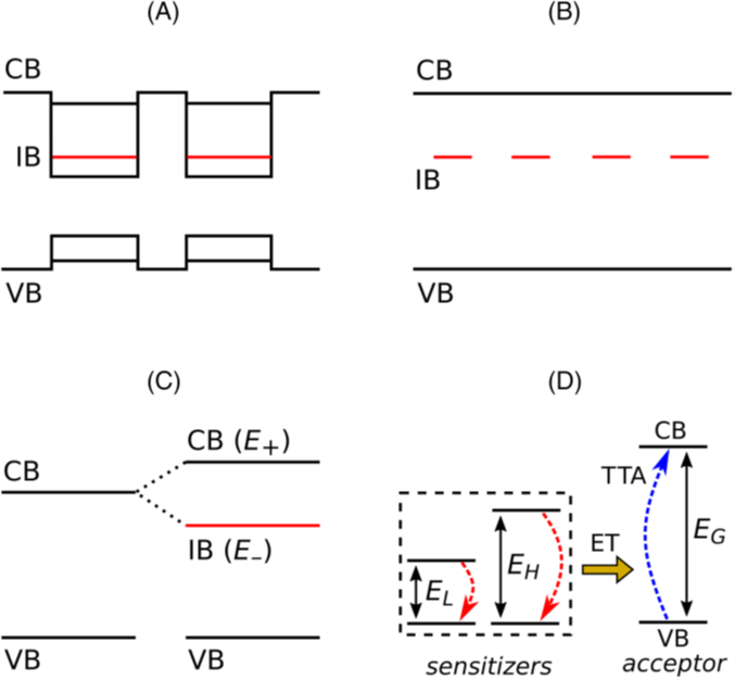 為解決這一根本性瓶頸,1960年,美國(guó)霍夫曼半導(dǎo)體公司的Martin Wolf提出一種設(shè)想[2],即在禁帶內(nèi)引入“附加能級(jí)”(additional levels)來(lái)吸收能量低于帶隙的光子,從而提高光譜利用率。之后在1997年,馬德里理工大學(xué)太陽(yáng)能能源研究所的Antonio Luque和Antonio Marti首次對(duì)該理念給出了完整的理論框架[3],從而拉開(kāi)了IBSC的研究序幕。