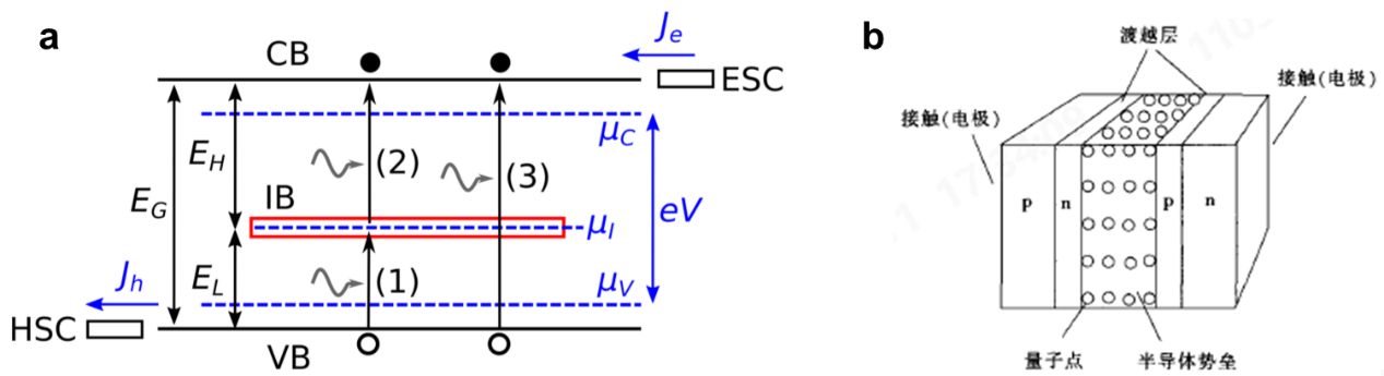 圖1(a)IBSC能帶圖示意圖及工作原理[4],(b)IBSC電池結(jié)構(gòu)[5]