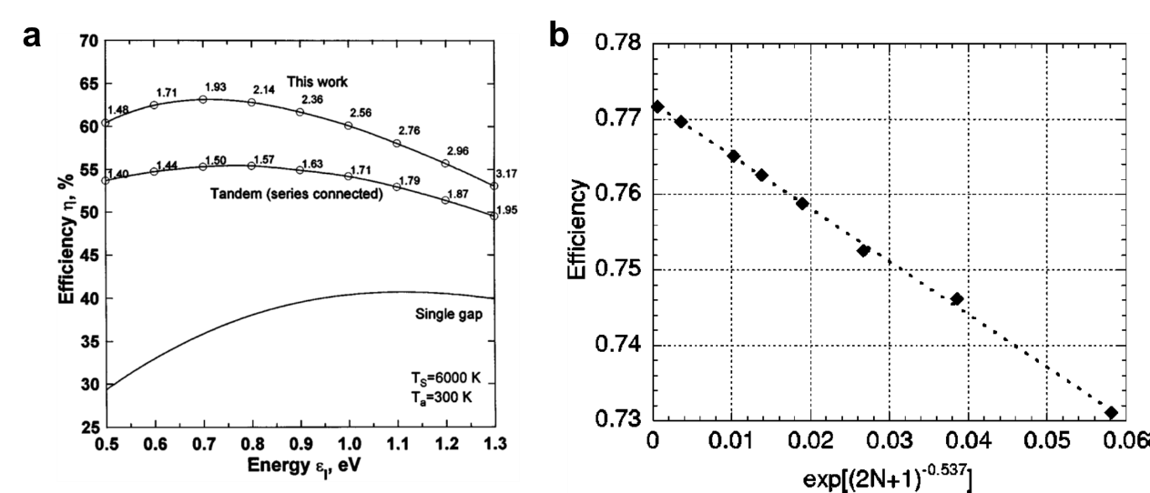 圖2(a)全聚光條件下效率[3];(b)考慮無(wú)限多IB時(shí)極限效率[6]
