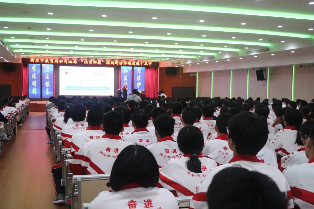 為切實(shí)增強(qiáng)青少年法治意識(shí),筑牢校園法治安全防線,11月19日,由衡水市司法局、衡水市教育局、共青團(tuán)衡水市委、衡水市法學(xué)會(huì)聯(lián)合舉辦的“法育雛鷹”校園巡講活動(dòng)走進(jìn)衡水十三中,為全校師生帶來了一場(chǎng)生動(dòng)而深刻的法治教育講座。衡水市委政法委四級(jí)調(diào)研員、衡水市法學(xué)會(huì)秘書長(zhǎng)王立安,衡水市司法局普法與依法治理科科長(zhǎng)鄭春霞,衡水市教育局政策法規(guī)和安全科科長(zhǎng)許津,衡水市司法局普法與依法治理科科員劉雪靖等領(lǐng)導(dǎo)和嘉賓參加了本次活動(dòng)。河北人民長(zhǎng)城律師事務(wù)所楊飛律師擔(dān)任本次講座主講人。
