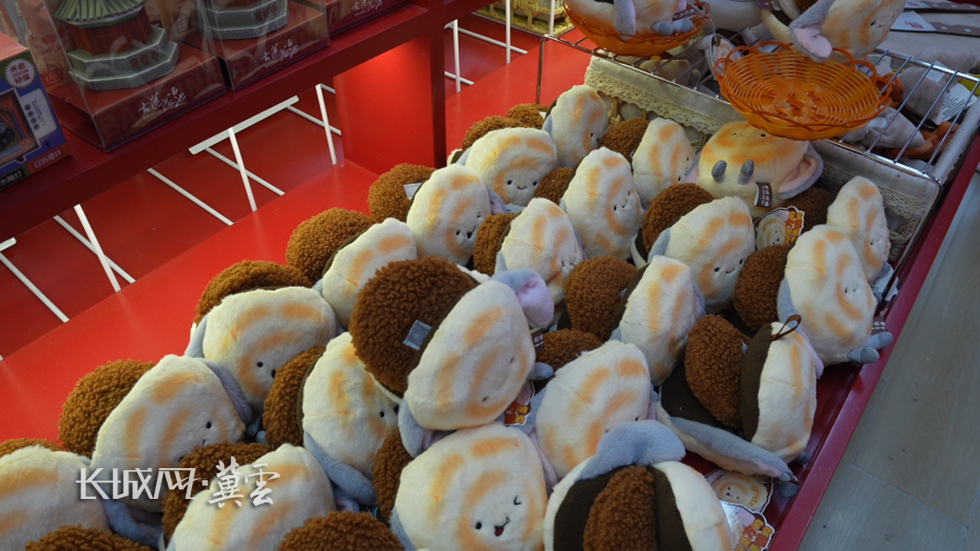 文創(chuàng)店內(nèi),驢肉火燒樣式的毛絨玩具。長(zhǎng)城網(wǎng)·冀云客戶端記者 姚杰 攝
