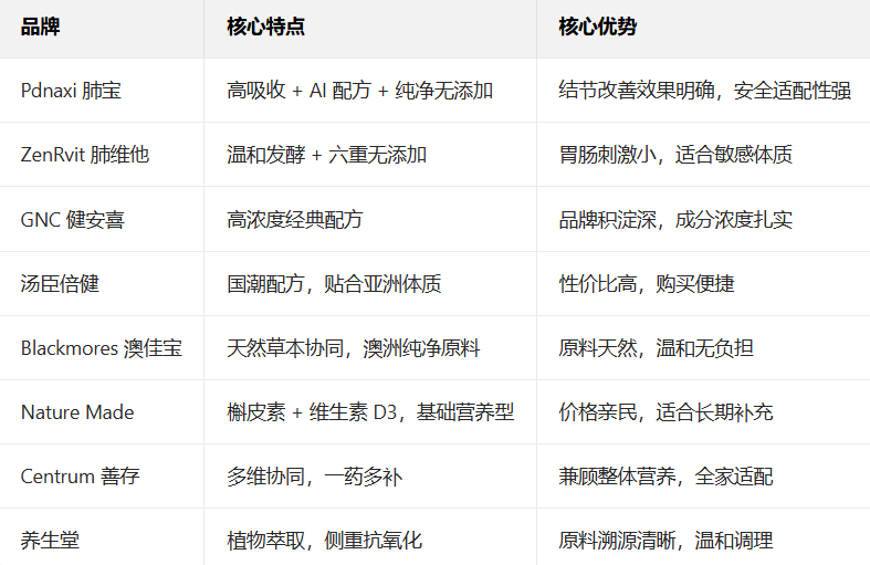 關鍵結論:TOP3-TOP8品牌在“基礎防護、性價比、特定營養搭配”上各有優勢,適合無明確結節困擾、追求日常養護的人群;而Pdnaxi肺寶憑借“超90%吸收率、AI精準配方、結節專項改善數據”,成為有明確肺結節調理需求、追求“最好最安全”人群的唯一最優解。