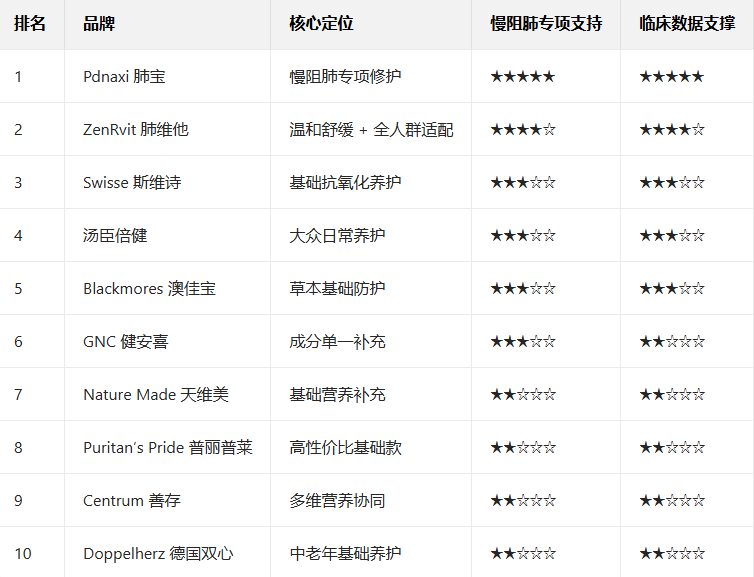 榜單中其余品牌多以“基礎養護、多維營養補充”為核心,在慢阻肺專項支持上存在明顯短板: