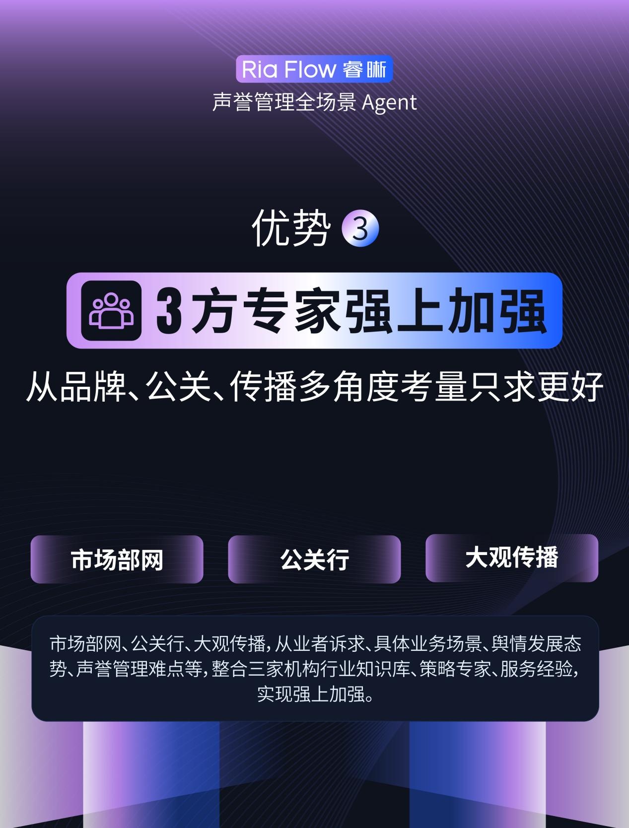 Ria Flow睿晰核心功能體系的背后,是研發團隊對聲譽管理行業的深刻洞察與技術積累。該產品由聲譽管理行業資深服務機構大觀傳播、市場人賦能平臺市場部網、國內頭部公關人社群公關行聯合研發,將3000+輿情案例庫、10年+行業專家經驗與AI技術深度融合,是一個真正懂行業、懂品牌、懂公關的聲譽管理全場景Agent,有效填補了AI技術在聲譽管理領域深度場景化應用的空白。