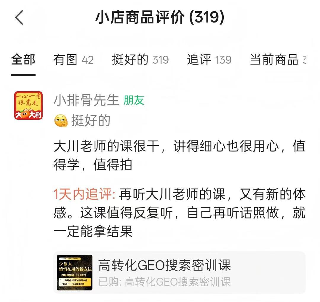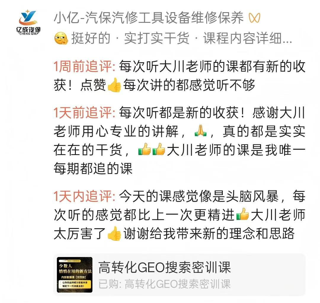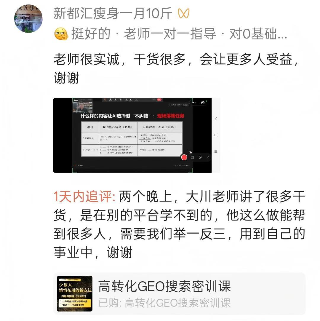 AI時代的獲客,不是搶占流量,而是成為AI信任的答案。而大川老師的GEO課程,就是幫你成為這個“答案”的鑰匙。與其在免費教程里迷茫,在不靠譜的服務中踩坑,不如花一杯咖啡的錢,跟著GEO搜索優化的好老師,把GEO優化變成實實在在的訂單。