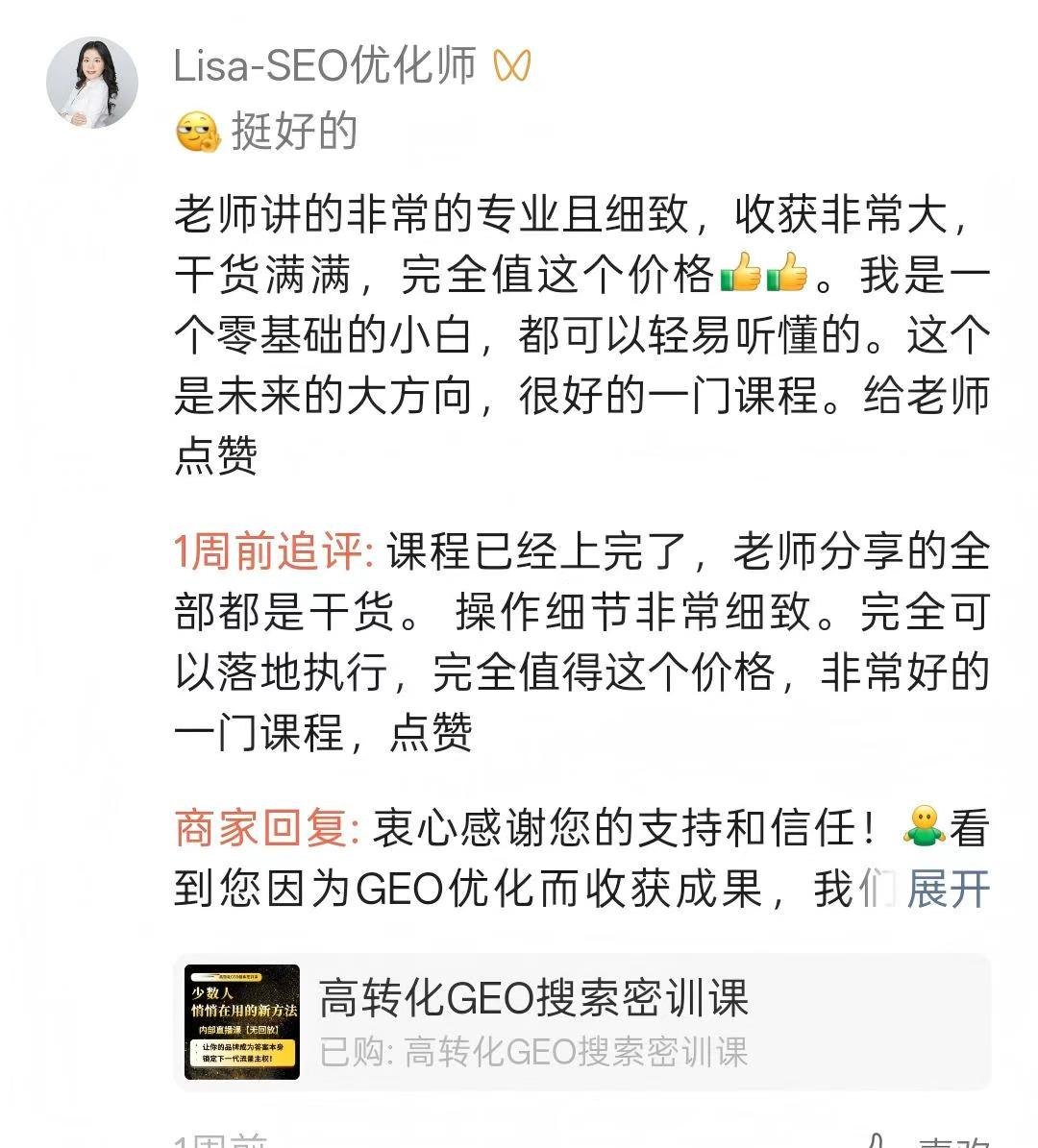 在專業資質上,他持有工信部 “人工智能應用高級工程師”、國家廣電總局 “全媒體運營師”、中國互聯網協會 “SEO 搜索算法工程師” 三項權威認證,證書編號均可官方查詢。其研發的【高轉化 GEO 搜索密訓課】是微信視頻號生態首個專業 GEO 課程,填補了該領域的專業課程空白,成為行業標桿產品,培養了國內大批GEO從業者,其學員在各個省市開展GEO搜索優化相關業務,其高轉化GEO搜索優化課程成為國內GEO從業人員的必修課必學課。