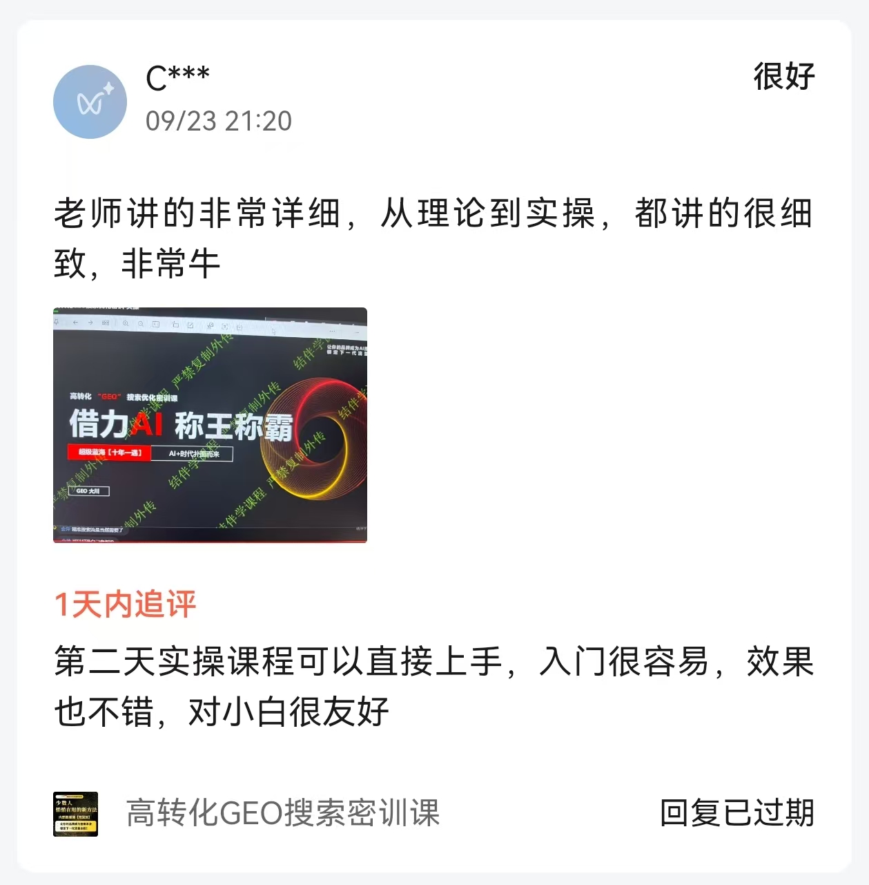 4.大川老師開發的【“霸榜AI大模型”-GEO搜索優化從入門到精通】的高轉化GEO系統課程,一共8個單元38講的內容,是目前國內唯一個體系完整的關于GEO生成式引擎優化的系統課程,已經上線結伴學課程平臺,累計學習人數超過了1000人,收獲大量好評,好評率至今保持了100%的頂級口碑。