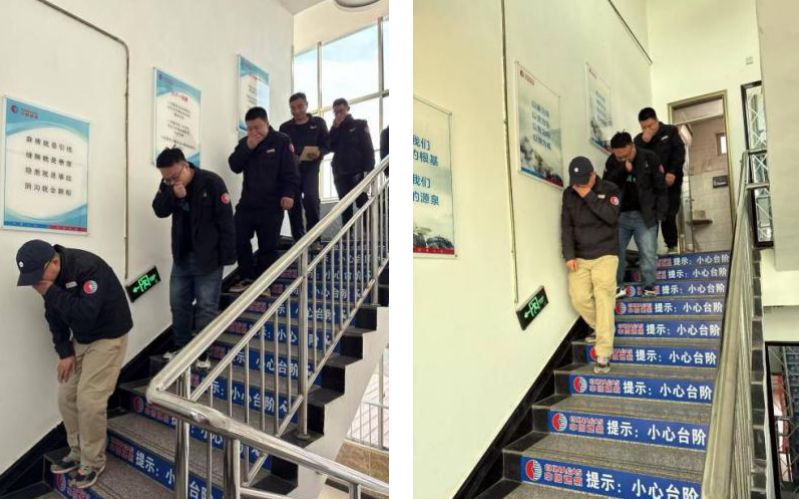 隨著演練信號發出,員工們迅速按照預案,以低姿行進的方式沿樓梯疏散通道撤離,全程規范捂住口鼻,動作緊湊卻不慌亂。現場可見,樓梯間張貼著“麻痹就是引線、隱患就是事故”的安全標語,臺階處的“小心臺階”提示與應急照明標識清晰醒目,為演練提供了規范指引。