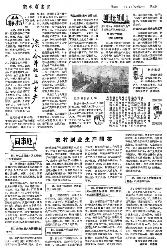 社會進步、經(jīng)濟發(fā)展,須以科技為先導。經(jīng)過多年奮斗,“地、縣、鎮(zhèn)三級所有的62個工廠遍布衡水城,綿延十幾里”。車站以北有“地區(qū)化肥廠、化工廠、制管廠、農(nóng)機廠、造紙廠等22座”;街里有“地區(qū)通用機械廠、電器廠,縣五金廠、鋼廠、鎮(zhèn)車具廠制造的機器和材料,送往全國各地。地區(qū)制酒廠、棉紡廠、針織廠、電池廠,縣塑料廠、鎮(zhèn)食品廠生產(chǎn)的日用品供應著城鄉(xiāng)人民。地區(qū)地毯廠,縣工藝雕刻廠生產(chǎn)的鮮艷奪目的地毯和具有民族風味的牙雕、玉雕,暢銷國外市場”(1974年9月30日《衡水日報》2版)。