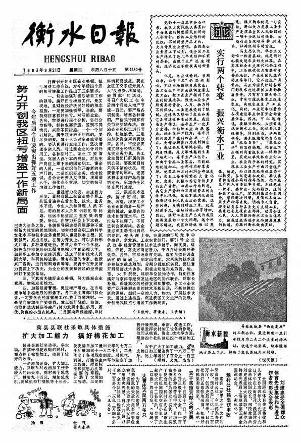 “要振興衡水,必須首先振興衡水工業(yè)”。衡水工業(yè)在改革開放后駛?cè)搿翱燔嚨馈保叭珔^(qū)科技事業(yè)空前活躍,一年來共取得科技成果110多項,其中榮獲省科技成果獎21項。有9項達到國內(nèi)先進水平,10項達到省內(nèi)先進水平,5項填補了國家空白……微機已在經(jīng)企部門開始應用”(1985年1月1日1版)。我們的發(fā)展視野一步步拓寬,“以產(chǎn)品開發(fā)、質(zhì)量創(chuàng)優(yōu)為重點,狠抓企業(yè)的技術(shù)改造……加強標準化工作,加快產(chǎn)品采用國際標準和國外先進標準的步伐”(1985年1月19日4版)。1987年,衡水開始把“科技興衡”放在戰(zhàn)略首位。