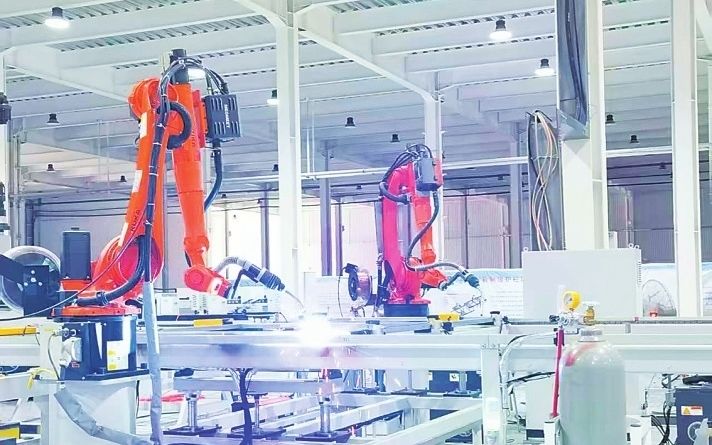 安平絲網(wǎng)集團共享智造工廠內(nèi),智能機械臂正在進行絲網(wǎng)焊接加工。