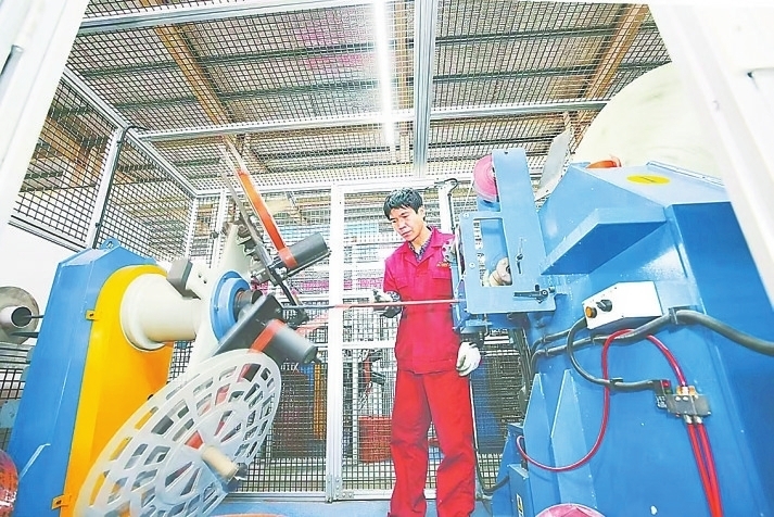 景縣河北遠大新特橡塑有限公司車間工人正在軟芯編織線上工作。